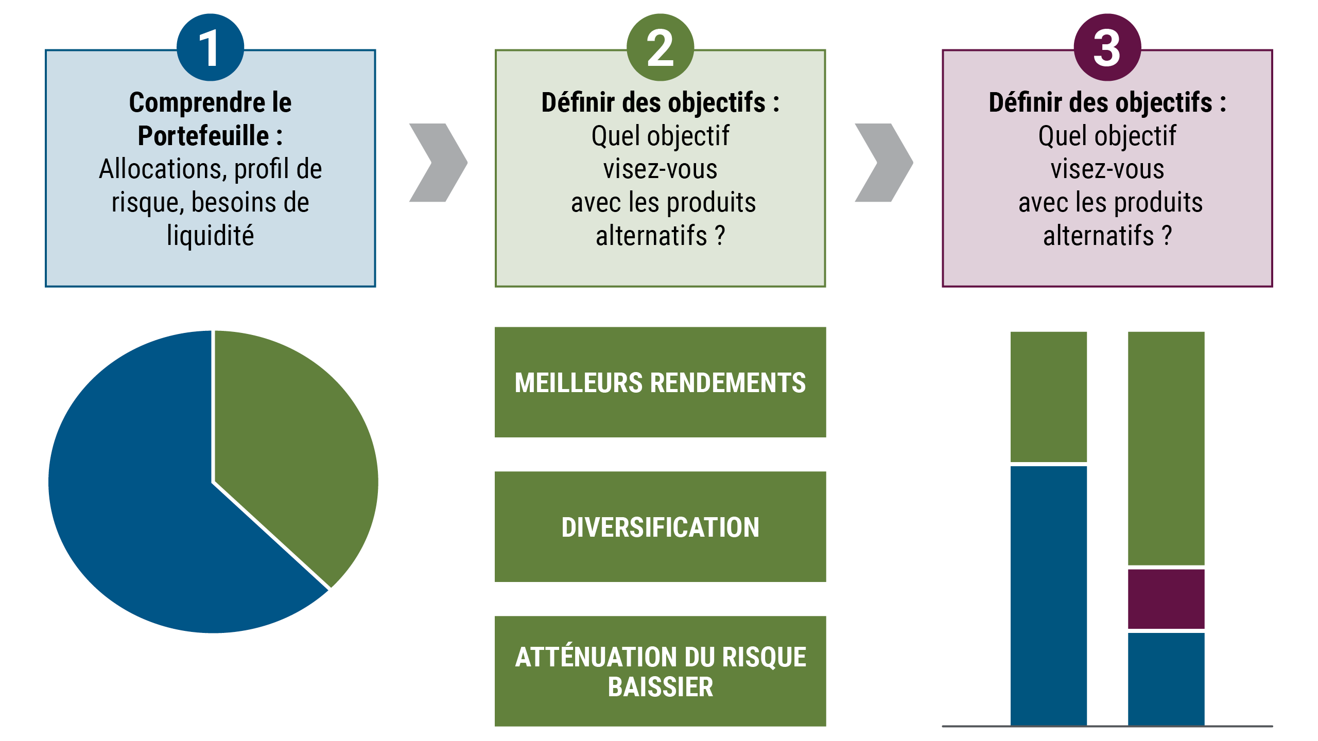 Les trois étapes ci-dessous peuvent aider les investisseurs à mettre en place une allocation aux investissements alternatifs :