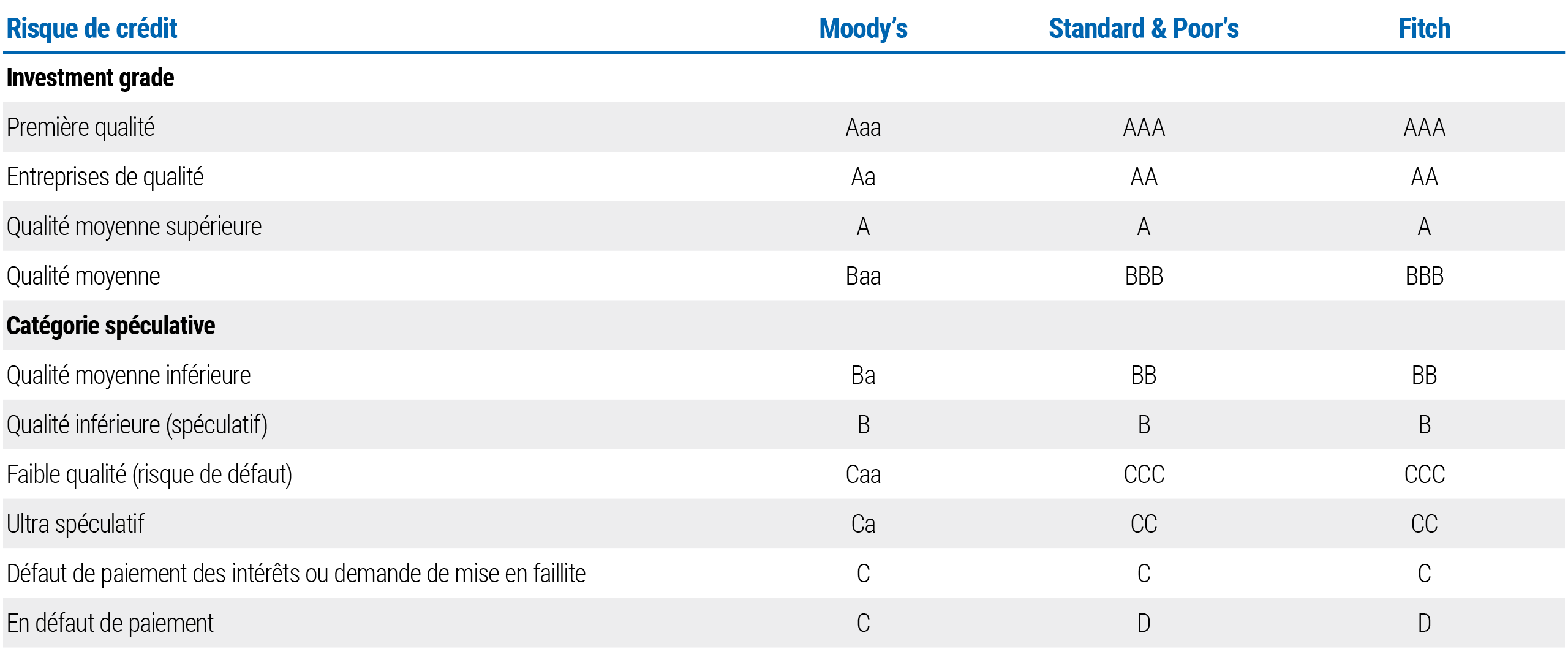 Les agences de notation évaluent les émetteurs d'obligations et leur attribuent des notes, comme indiqué dans le tableau ci-dessous. Les émetteurs sont notés sur leur capacité à payer les intérêts et le principal selon l'échéancier prévu. Ceux dont on considère qu'ils présentent un risque de défaut sur le paiement des intérêts ou le remboursement du principal reçoivent une note de qualité inférieure à investment grade (voir tableau 1). Ces émetteurs doivent par conséquent payer des coupons plus élevés pour inciter les investisseurs à acheter leurs obligations.