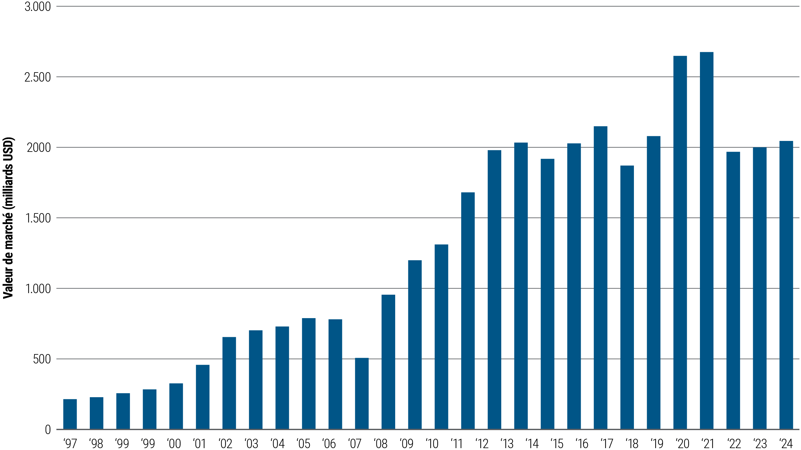 Le marché du haut rendement a évolué depuis cette époque. Aujourd’hui, la majeure partie de la dette à haut rendement est utilisée à des fins générales par les entreprises, comme par exemple pour financer des besoins en capitaux ou consolider et rembourser des lignes de crédits souscrites auprès de banques. Essentiellement concentré sur les États-Unis dans les années 1980 et 1990, le secteur du haut rendement a connu une croissance considérable à travers le globe en termes d’émissions, de titres en circulation et d’intérêt des investisseurs. Le graphique ci-dessous montre la croissance du marché du haut rendement, les données pour 2024 étant celles publiées depuis le début de l'année.