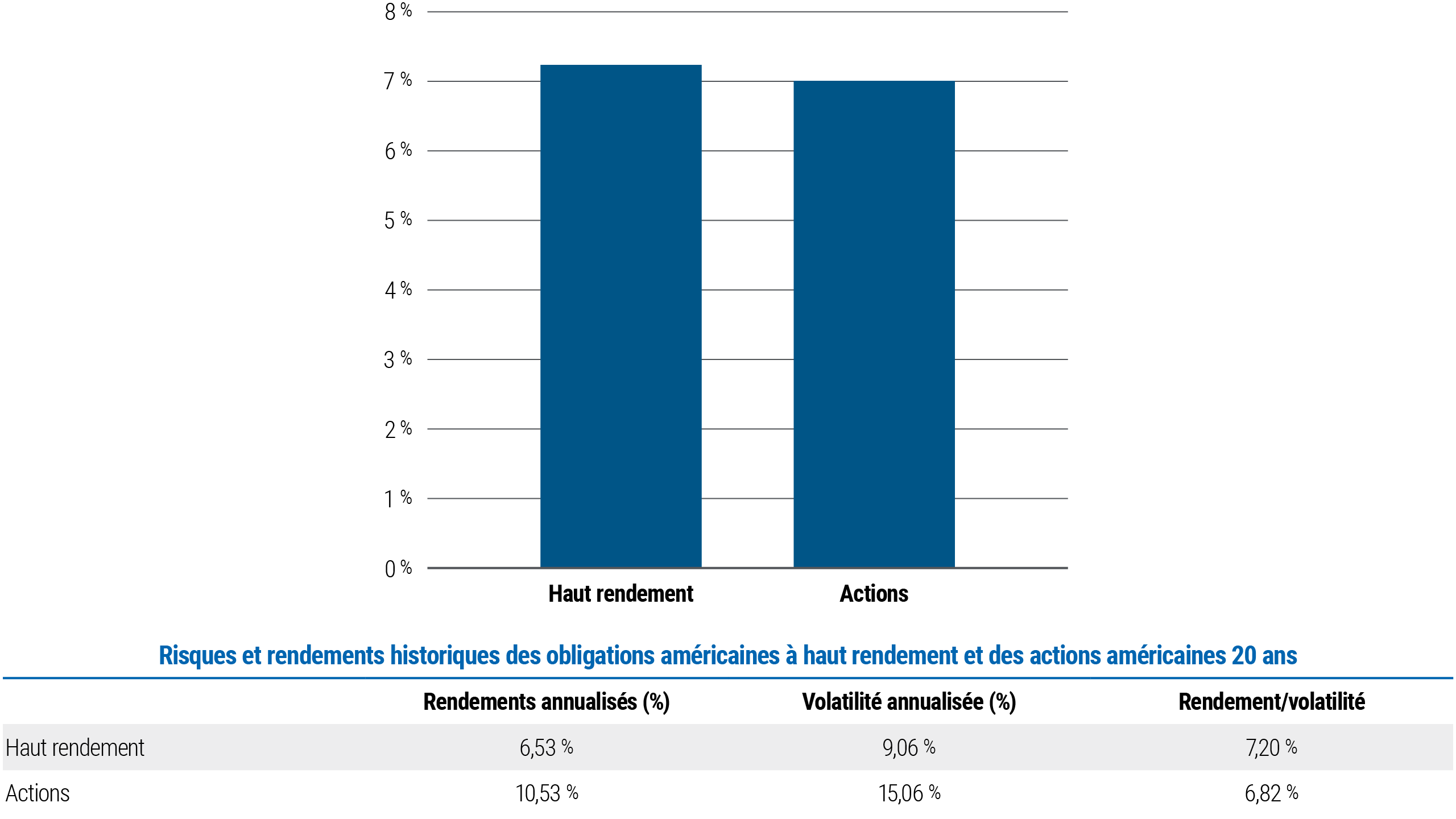 Le secteur du haut rendement affiche généralement une faible corrélation avec les autres composantes du marché obligataire. Ces obligations sont également moins sensibles au risque de taux d'intérêt. En raison de ces facteurs, consacrer une partie de son portefeuille au haut rendement peut permettre d'en augmenter la diversification. En outre, les investissements dans les obligations à haut rendement ont historiquement offert des rendements similaires à ceux des marchés actions, mais avec une volatilité moindre.