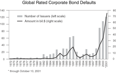 In an environment of increasing economic/financial risk, PIMCO's stance will focus first on protection of principal and secondarily on increasing return. Granted, as Lynch suggests, it has never paid to bet against America, but the current war introduces new variables that will likely change asset relationships for years to come. High yield/corporate spreads, emerging market yields, and the level and shape of the Treasury curve are currently in the process of transformation. High yield interest rates are increasing as the level of corporate bankruptcies accelerates as shown in the chart on the following page. Emerging market debt is being dragged down in price by an imminent default in Argentina and perhaps Turkey. The level of long term Treasury yields and short term as well are supersensitive to government trends in fiscal and monetary stimulation.