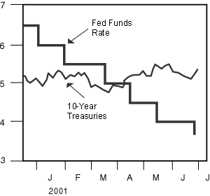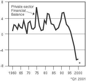 Well, why stop now? An objective answer would have to include the possibility that we don’t have to stop – that we can turn this economic slowdown back into a V-shaped recovery quicker than you can yell “hike”, by continuing to drive the private sector financial balance deficit further and further into red ink. To do so, though, would require a rejuvenation of business and consumer “animal spirits” that has typically been produced by easier money and lower interest rates from the Fed. Granted, Greenspan has moved quickly to re-induce confidence into the American – and therefore – global economy, but aside from some mild upticks in several consumer confidence surveys, something seems to be missing this time. In normal business cycles, six months after aggressive easing by the Federal Reserve the following three events have taken place: 1) stock markets have risen by 10-15%, 2) bond markets have declined in yield by at least 50 basis points, and 3) the U.S. dollar has depreciated in value. In combination, these three factors have been the reason why a V and not a half H-shaped recovery has invariably taken place. Stocks going up have promoted the consumer wealth effect as well as accelerated business investment. Bond yields going down have allowed for lower mortgage rates and generated substantial refi activity, which in turn has led to more consumer spending. And the weaker dollar has given manufacturing the breathing room to increase exports and profit margins as well.