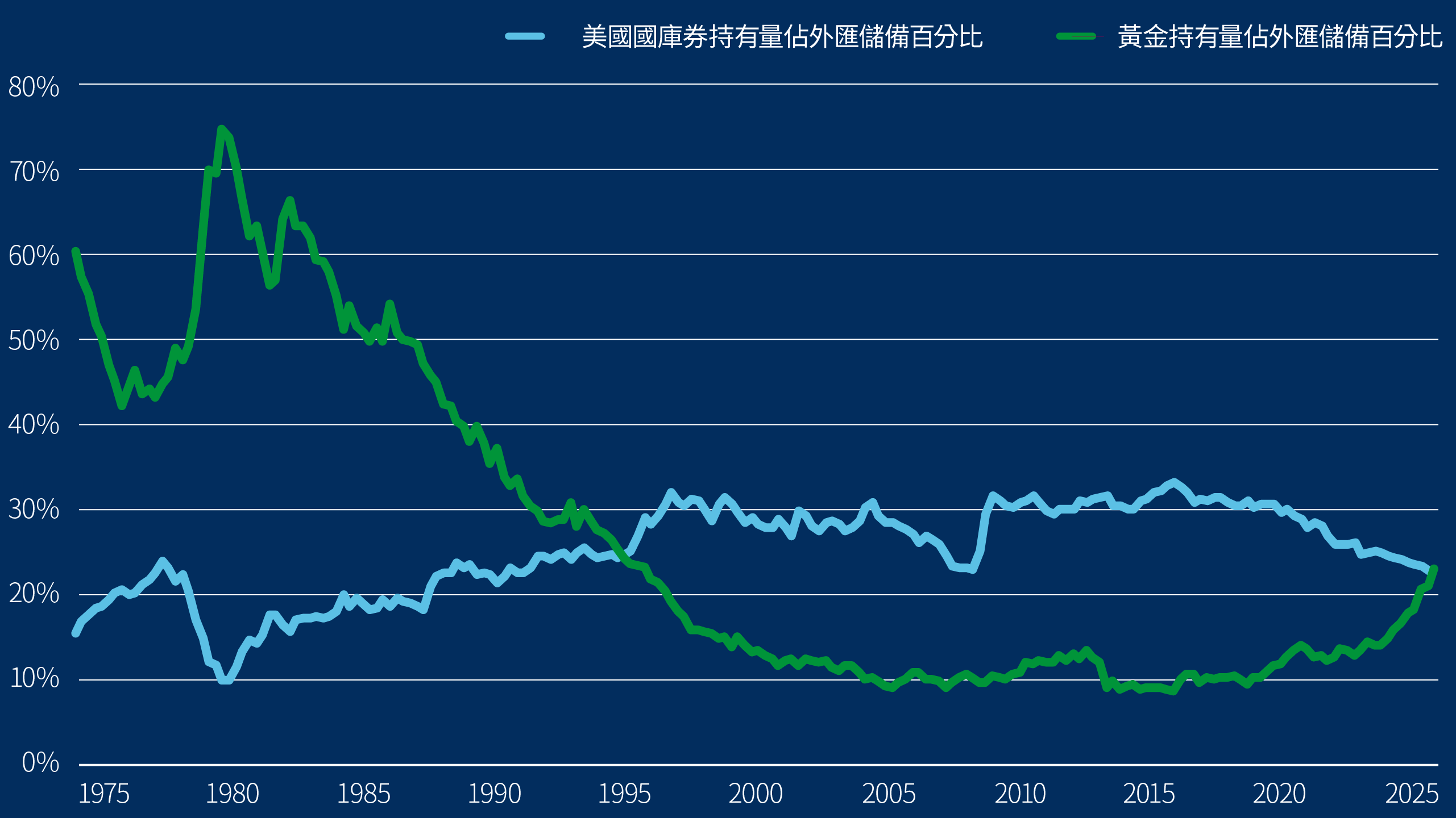 黃金的強勁升勢(近期突破每盎司4,300美元)已引起市場廣泛關注。即使在普遍承險的市場環境下,金價仍急升至歷史新高。投資者需要抗通脹、對沖地緣政治因素,以及為了減少依賴美元而分散投資,均有助鞏固黃金作為策略性資產的地位。全球央行現時持有的黃金已超越美國國庫券(見圖三),反映儲備管理出現轉變。