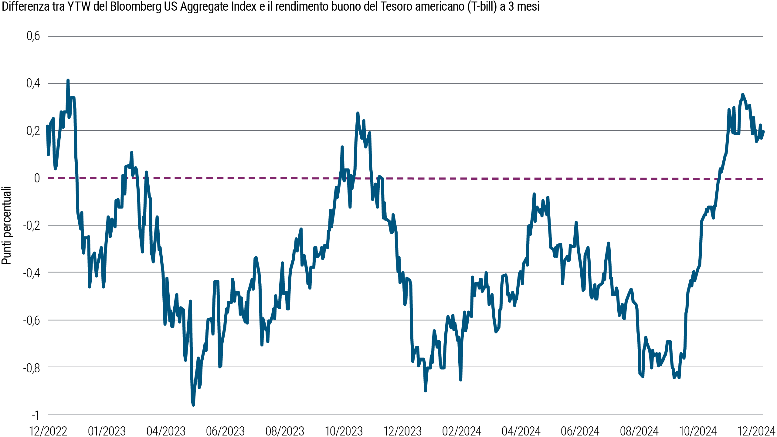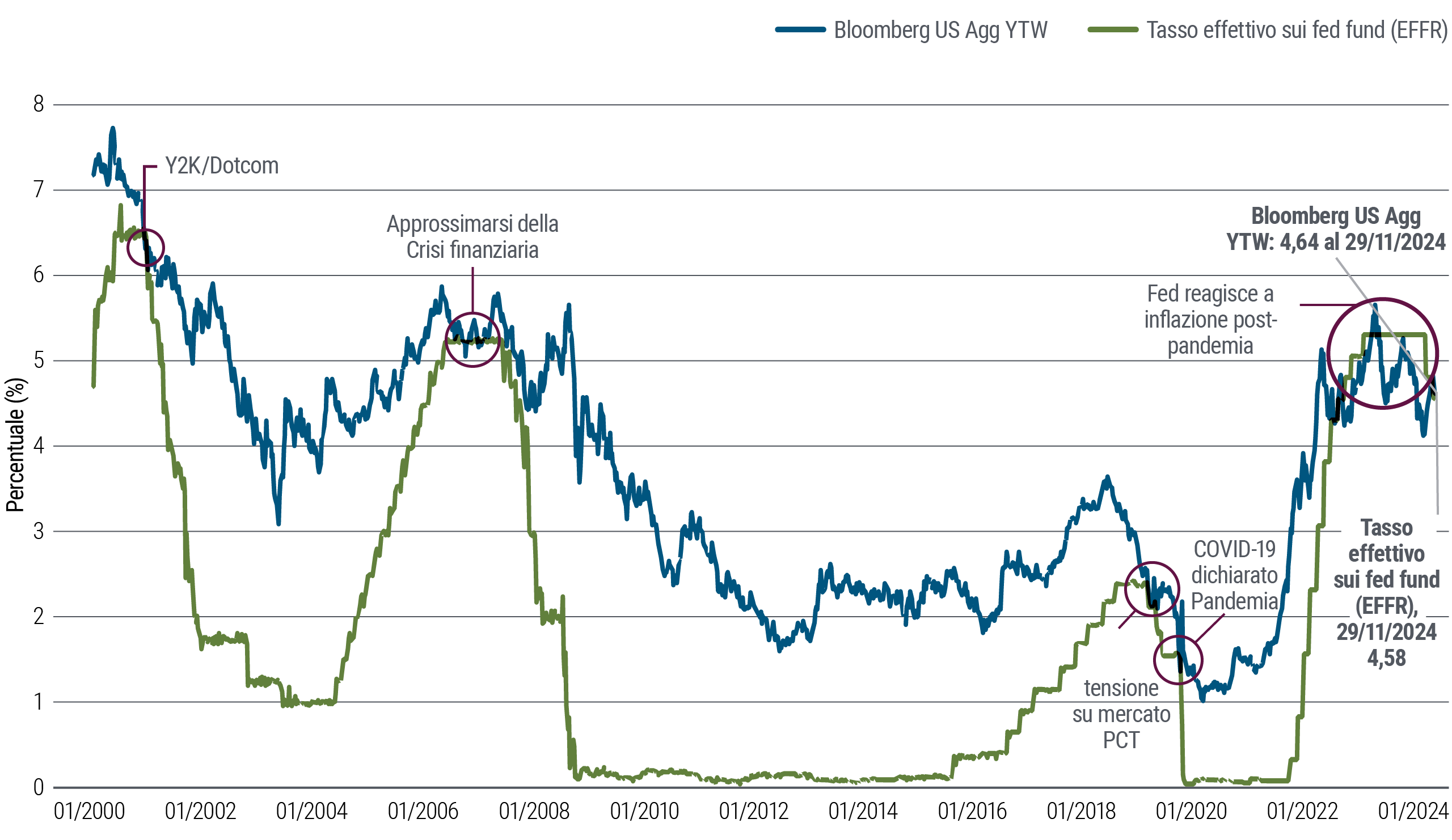 Con il normalizzarsi dei mercati e delle economie dopo gli sconvolgimenti della pandemia, tornano ad affermarsi i trend di lungo periodo. Un segnale importante del ritorno degli andamenti tipici storici è giunto a novembre quando per la prima volta da oltre un anno un importante parametro del rendimento obbligazionario del Bloomberg US Aggregate Index si è riportato al di sopra del tasso di politica monetaria della Federal Reserve.