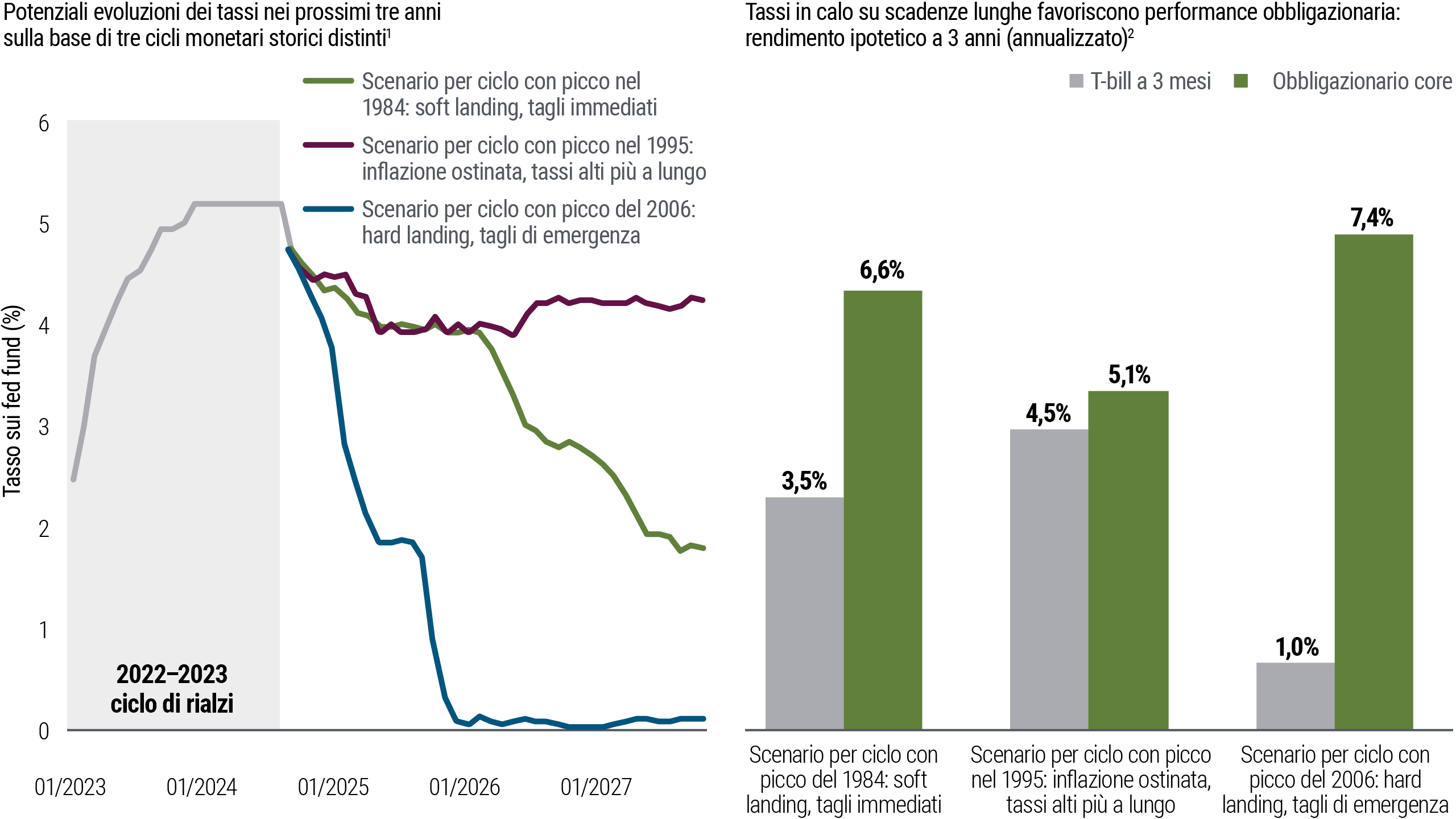 I segnali di mercato e le mosse della Fed indicano una svolta per i rendimenti obbligazionari. Gli elevati rendimenti di partenza coniugati allo scenario di tassi in discesa implicano prospettive positive per una ampia gamma di obbligazioni. Gli investitori che sono rimasti sul monetario potrebbero voler considerare di passare all’obbligazionario.