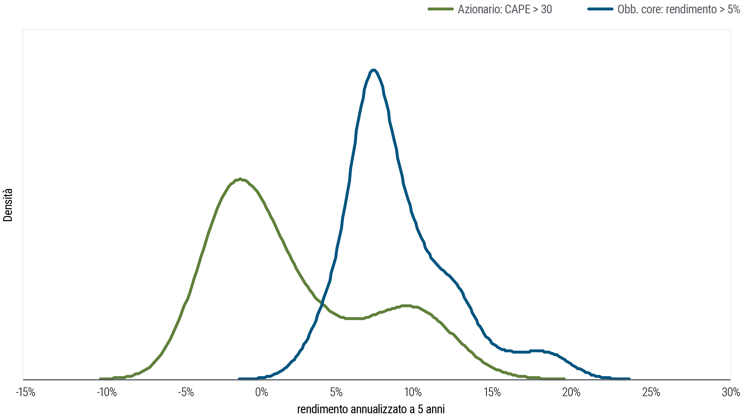 Sulla base delle attuali valutazioni e condizioni di mercato crediamo che l’obbligazionario liquido di alta qualità sui mercati pubblici offra valore interessante. I rendimenti di partenza sono attrattivi in confronto ad altri attivi lungo lo spettro del rischio e della liquidità, compreso il monetario, e storicamente i rendimenti di partenza sono stati un robusto indicatore della performance obbligazionaria a lungo termine.