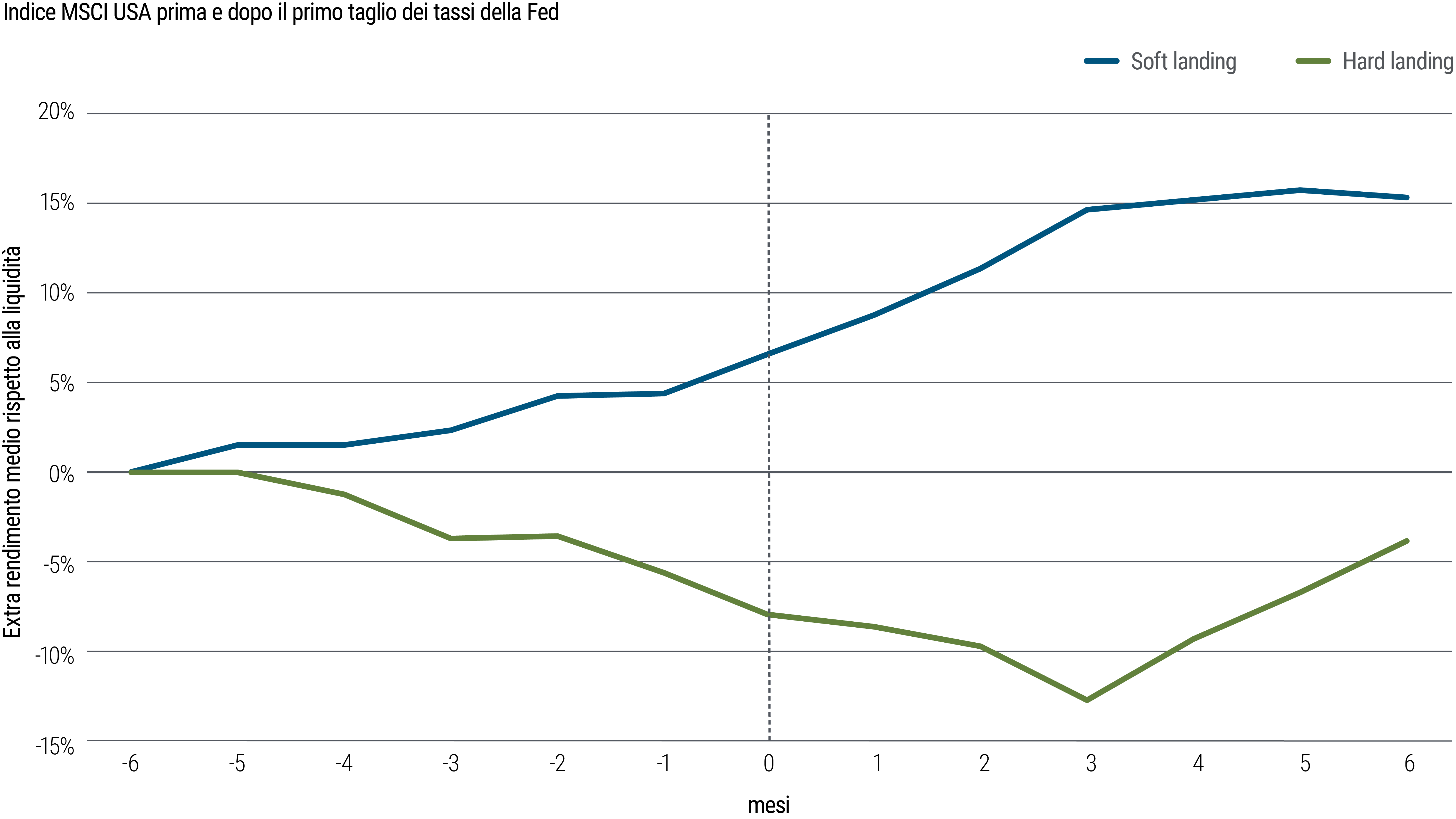 Sia negli hard landing che nei soft landing, l’avvio della riduzione dei tassi tipicamente ha comportato un rafforzamento della performance dell’azionario, quantomeno grosso modo nel primo mese, in quanto i tagli dei tassi in generale sostengono il sentiment e l’attività nell’economia reale. Tuttavia, poco dopo, i mercati azionari in genere cominciano a riflettere il contesto macroeconomico prevalente.