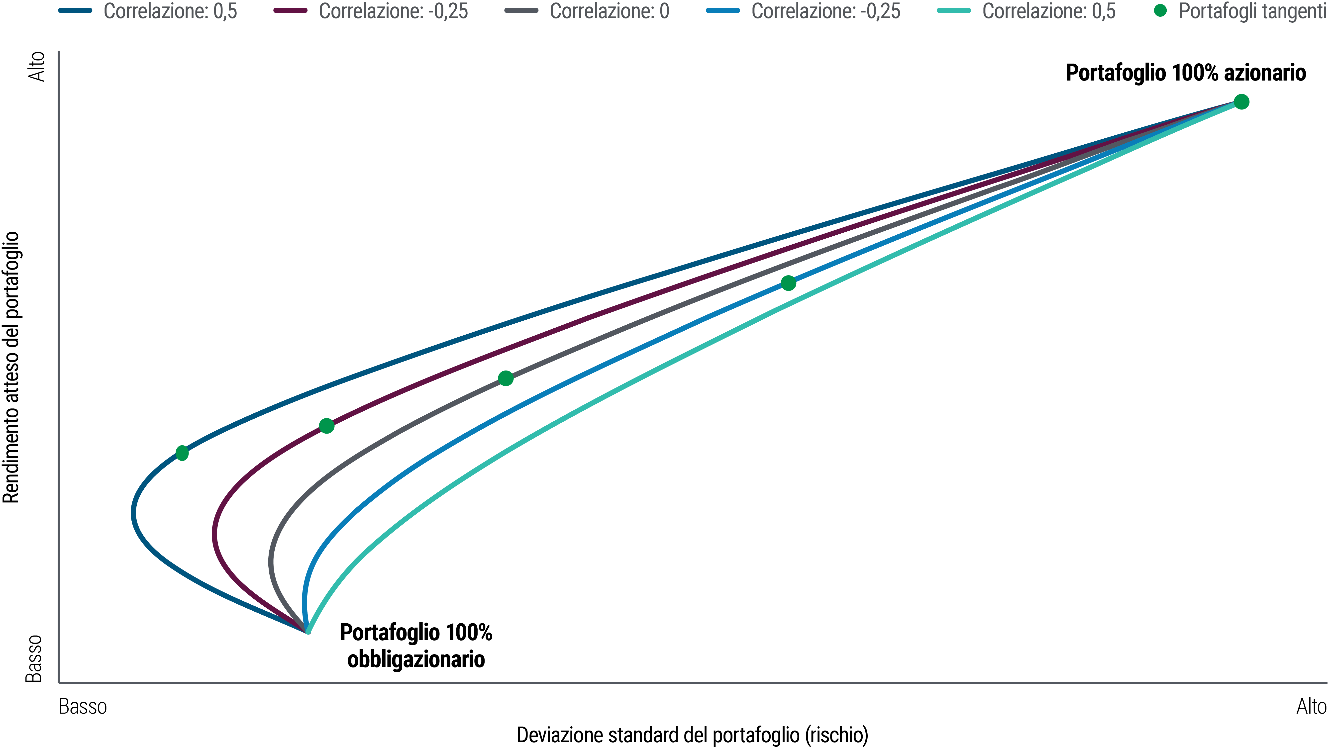 In generale, le correlazioni negative possono consentire di ottenere mix di attivi che incontrano minore volatilità rispetto al singolo attivo e di puntare al contempo a rendimenti attrattivi. Un’analisi di frontiera efficiente su portafogli ipotetici aiuta ad illustrarlo (cfr. Figura 2): quando la correlazione fra azionario e obbligazionario è negativa, ci sono aree lungo la porzione a minore rischio in cui gli investitori possono puntare su un mix di attivi che offre un profilo di rendimento potenzialmente più elevato a fronte di una minore volatilità attesa.