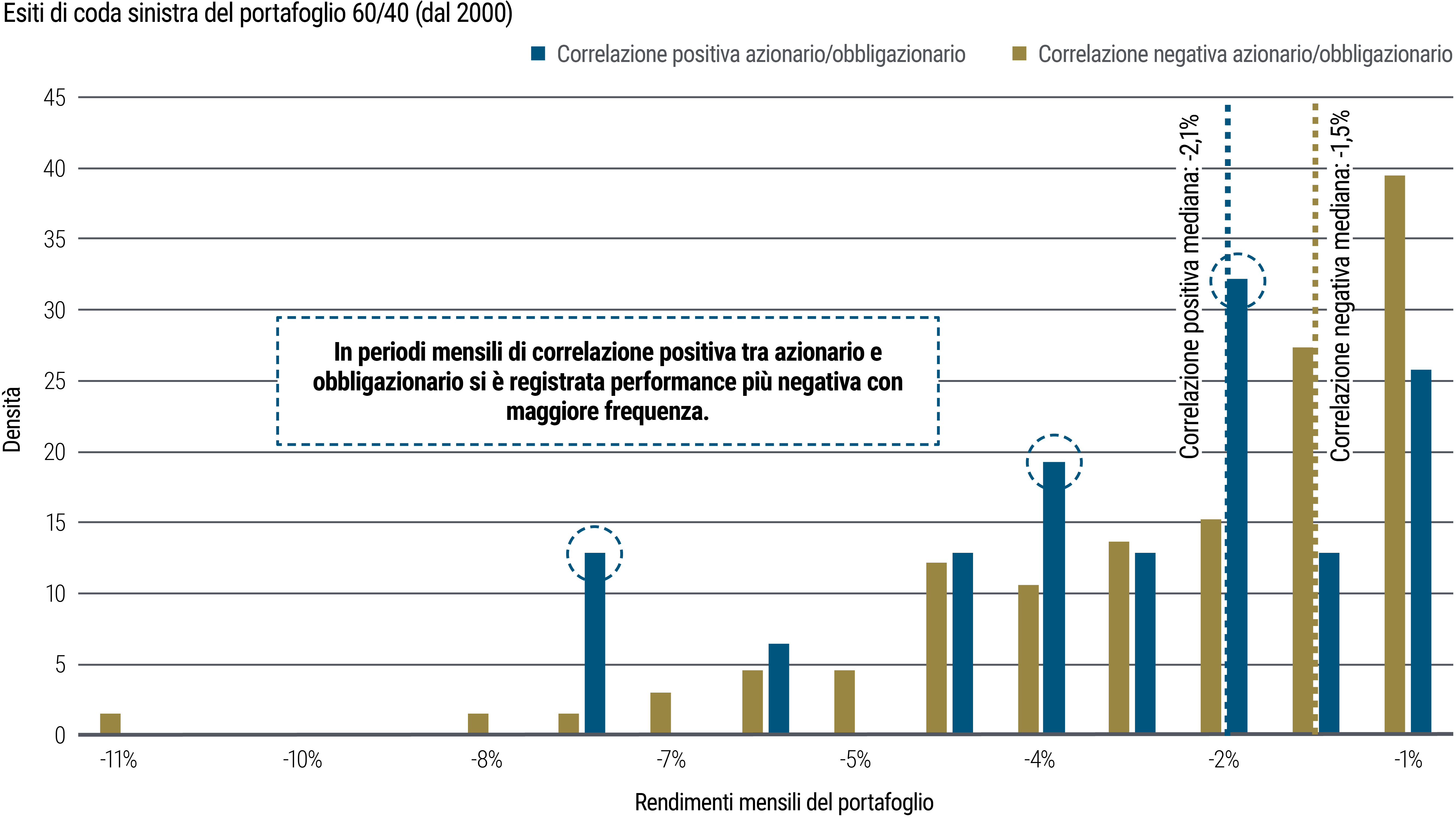 L’analisi storica di performance negativa in scenari estremi (“tail” o "di coda") per un portafoglio multi-asset semplice composto per il 60% da azionario e per il 40% da obbligazionario illustra i vantaggi della correlazione negativa fra azionario e obbligazionario (cfr. Figura 3). L’analisi indica infatti che tipicamente si osservano più seri esiti di coda sinistra (peggiori) per i portafogli multi-asset in periodi in cui la correlazione fra azionario e obbligazionario è positiva che in periodi con correlazione negativa. Questo resta vero anche se in gran parte delle recessioni c’è stata una profonda correlazione negativa fra azionario e obbligazionario con ribassi dell’azionario parzialmente compensati dai guadagni delle posizioni obbligazionarie.