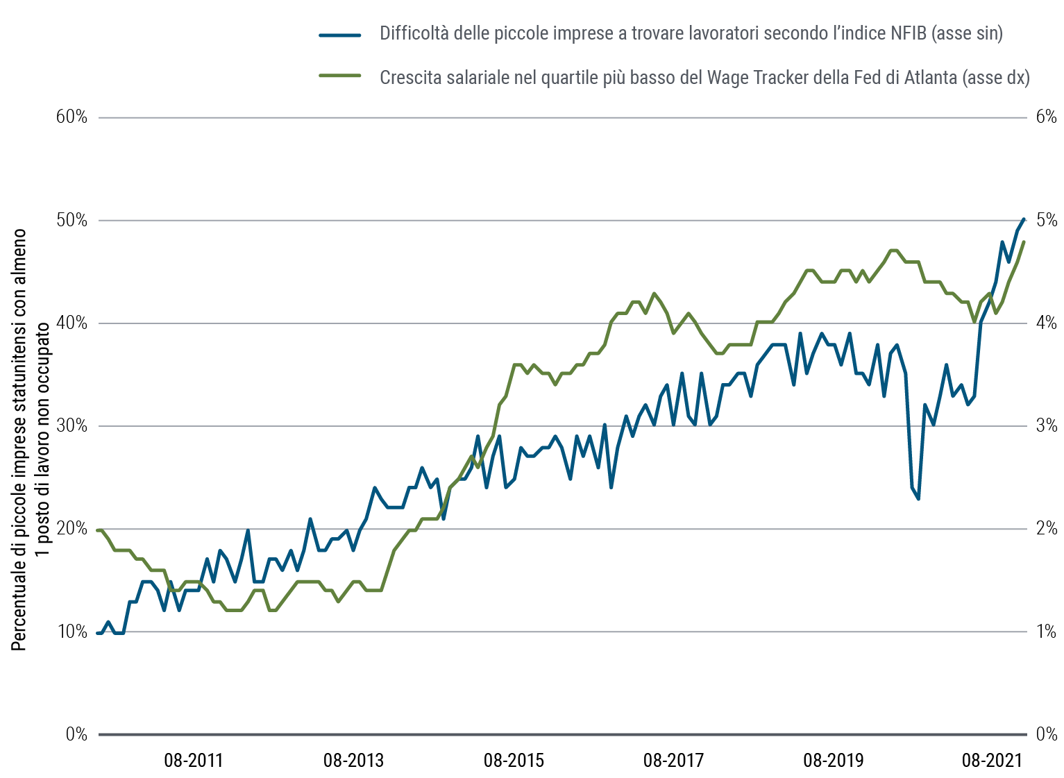 Gli investitori sono alle prese con gli effetti strutturali della pandemia sull’economia globale rispetto ai quali non c’è ambito più rilevante del mercato del lavoro, dove per fattori sia temporanei che più persistenti si è determinata carenza di forza lavoro. Tra i fattori di breve periodo che hanno esercitato pressioni sull’offerta di forza lavoro nel 2021 vi sono i protratti timori per il COVID-19, i sussidi pubblici e le difficoltà di avvalersi dei servizi per i figli. Questi fattori dovrebbero essere i primi ad allentare la morsa se i vaccini continueranno a dimostrarsi efficaci, gli effetti economici delle varianti del virus saranno gestiti, le scuole resteranno aperte e si accumuleranno evidenze che il progressivo venir meno dei sussidi di disoccupazione incoraggi le persone a tornare a lavorare. Sul medio termine, le restrizioni sull’immigrazione verosimilmente incideranno sulle prospettive.