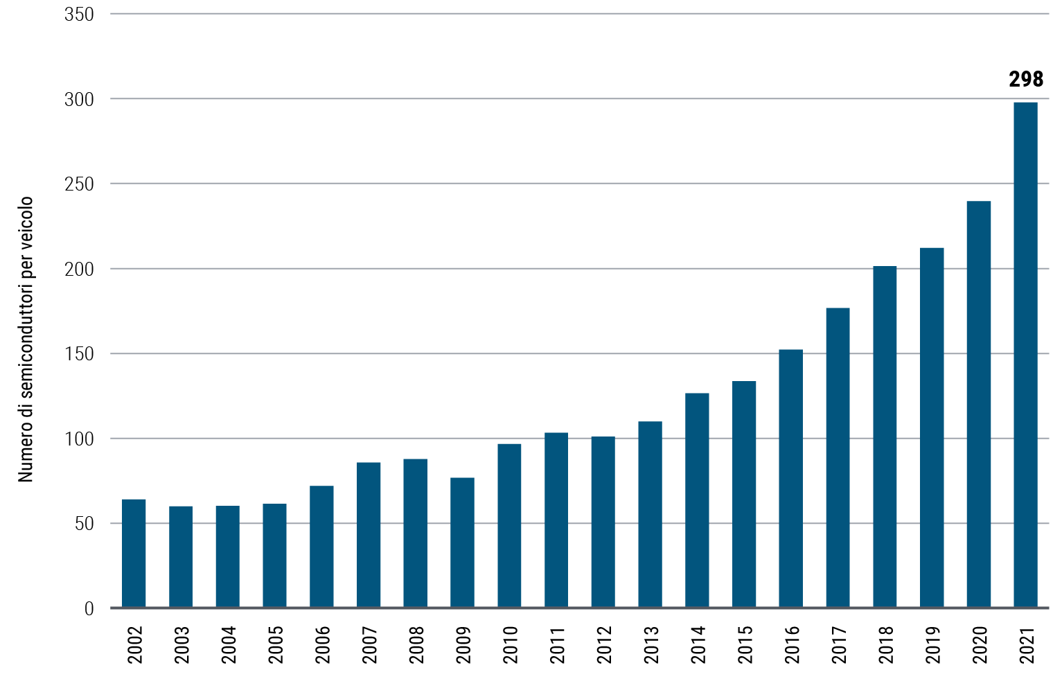 Tuttavia, la struttura del settore dei semiconduttori era fragile prima del COVID. La velocità esponenziale con cui le persone hanno abbracciato le novità in campo automobilistico (compresi i veicoli elettrici), nella telefonia (5G) e rispetto ad altri dispositivi connessi ha alimentato un’ondata travolgente di domanda che molti dirigenti di settore e osservatori avevano sottostimato. La Figura 2, ad esempio, evidenzia il significativo aumento del numero medio di semiconduttori nei veicoli nuovi. Sfide della pandemia a parte, ci aspettiamo che la domanda continuerà ad accelerare di buon passo mentre la capacità addizionale di realizzare chip aumenterà a un ritmo più lento. La più grande fonderia mondiale condivide la previsione di un mercato endemicamente nella morsa in ragione della domanda crescente per nuove applicazioni tra cui per l’energia verde, il metaverso e l’automazione. Noi crediamo che il mercato non stia prezzando nel modo giusto i cambiamenti che ci aspettiamo si verificheranno nei prossimi anni e riteniamo che le imprese in tutta la filiera dei semiconduttori siano destinate a rendimenti differenziati.