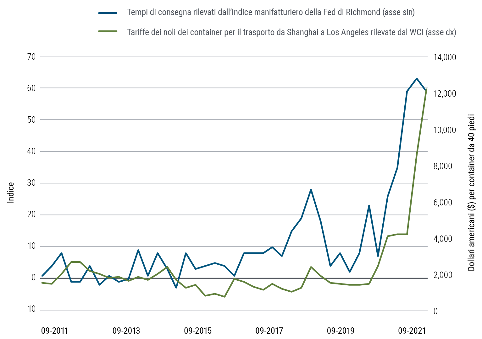 Il trasporto marittimo è stato un altro fattore che ha impedito all’offerta di soddisfare la domanda quest’anno. Lo spostamento dai servizi ai beni nella spesa dei consumatori durante i lockdown ha innescato una decisa impennata della domanda che ha portato i volumi di traffico sulla rotta transpacifica a crescere del 28% rispetto ai livelli precedenti la pandemia. La diffusione del coronavirus ha congestionato molte rotte e vi sono stati incidenti su scala globale tra cui quello di grande risonanza avvenuto nel Canale di Suez. Il pugno di ferro della Cina nei confronti del COVID e diversi disastri climatici hanno determinato gravi intoppi in quanto i maggiori terminal mondiali sono stati costretti a chiudere. Questi avvenimenti si sono sovrapposti e hanno aggravato le strozzature nel trasporto marittimo comportando un incremento mai visto prima delle tariffe dei noli e pari a dieci volte per il trasporto da Shanghai a Los Angeles (si veda Figura 3).