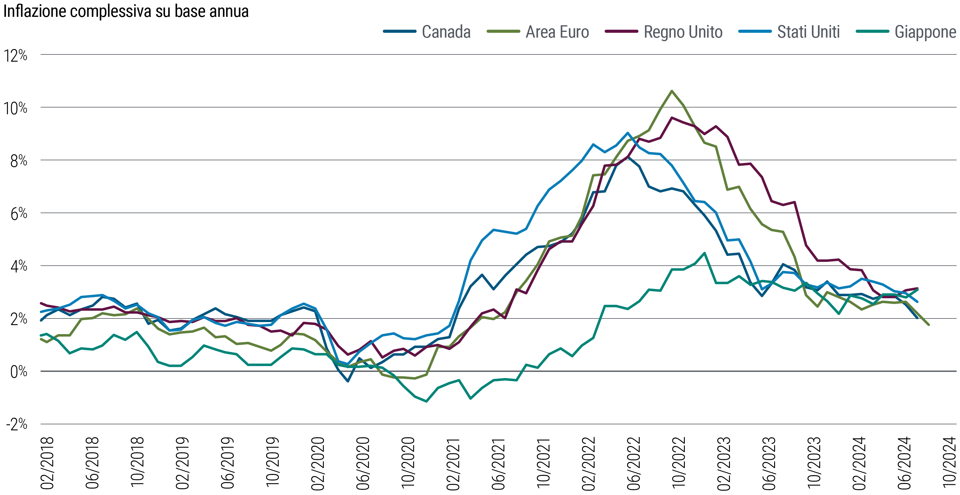 La domanda più fiacca, il mercato del lavoro più debole e le aspettative d’inflazione ancorate fanno prevedere un’inflazione in prossimità del target nel 2025 anche negli altri mercati sviluppati. Tra questi ultimi si distinguono il Canada, dove è più probabile che l’inflazione si attesti a livelli inferiori al target, e l’Australia, dove gli indicatori del mercato del lavoro segnalano minor progresso su questo fronte.