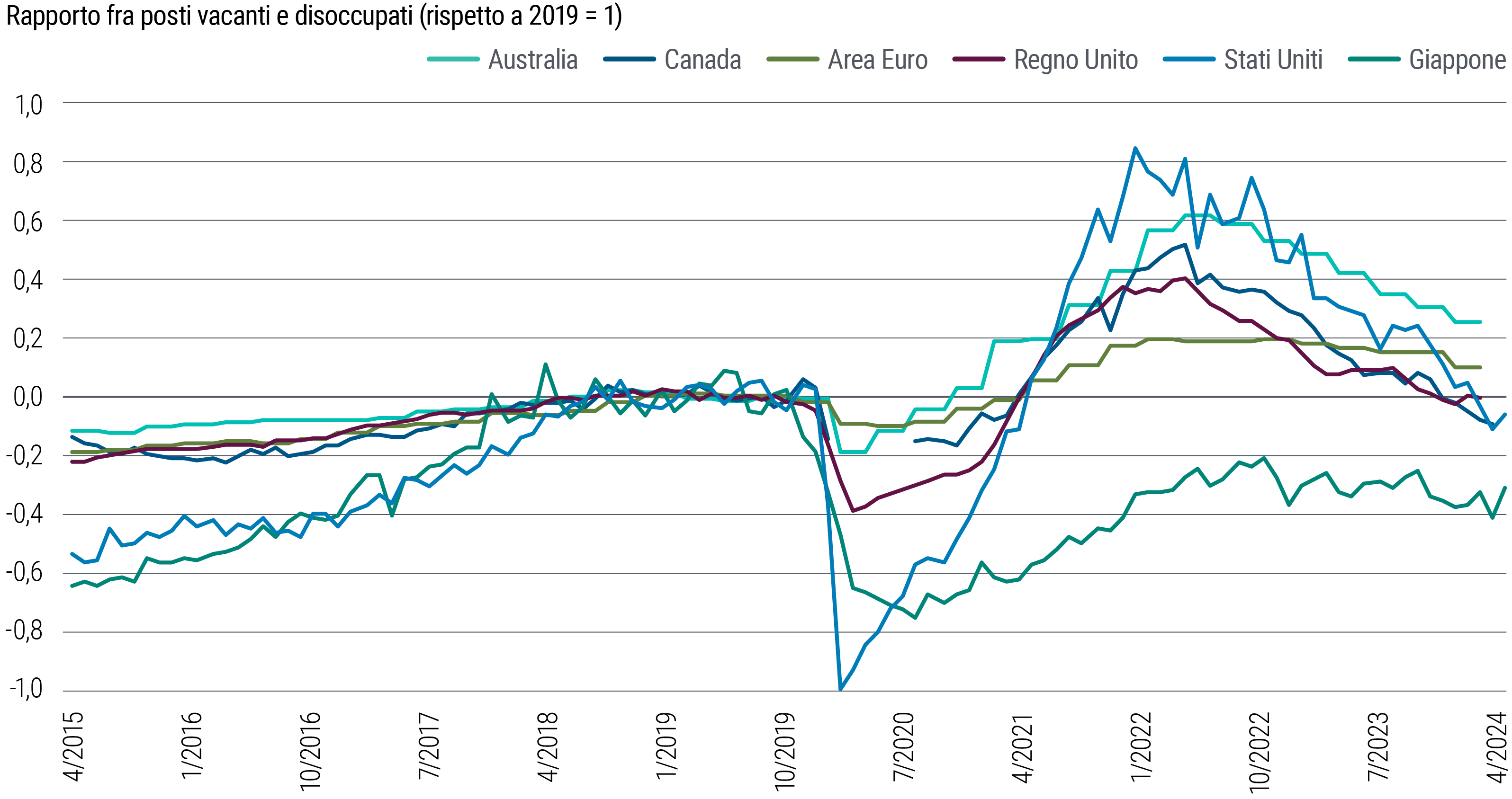 La maggiore resilienza della crescita economica e dell’inflazione negli Stati Uniti ha ritardato l’avvio del ciclo di allentamento monetario da parte della Federal Reserve rispetto ad altre banche centrali. Gli indicatori prospettici segnalano tuttavia una probabile maggiore convergenza dell’inflazione verso il target del 2% della banca centrale americana nel 2025. I fattori a sostegno di questa previsione comprendono un incremento del costo unitario del lavoro più vicino al 2%, un rapporto posti vacanti/disoccupazione inferiore ai livelli del 2019 (cfr. Figura 2) e l’aumento del tasso di disoccupazione che potrebbe rischiare di superare l’area di tranquillità della Fed che è intorno al 4,2%.