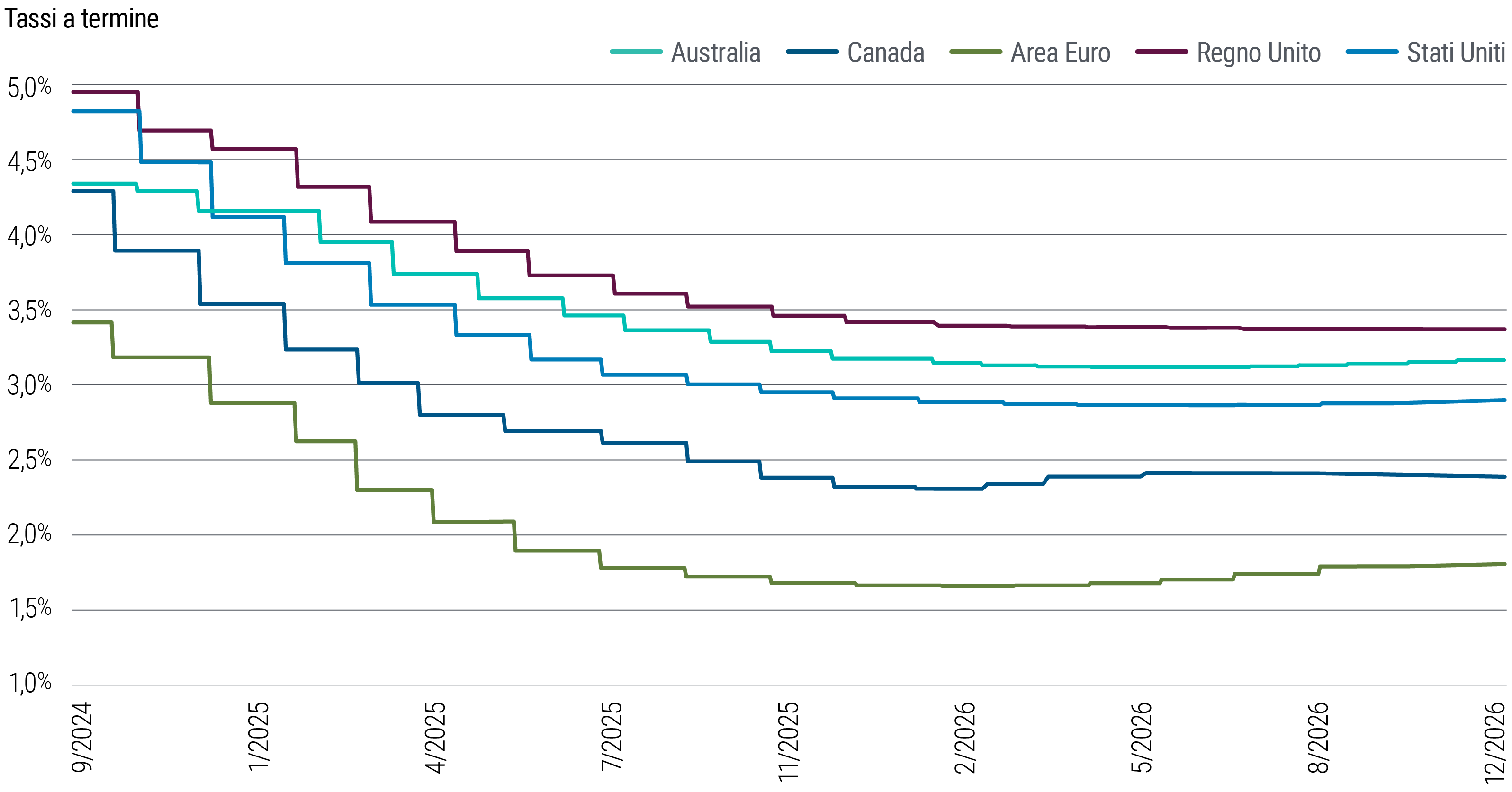 Considerando la dispersione nelle prospettive economiche e nei percorsi di politica monetaria delle banche centrali, prediligiamo posizioni di duration nel Regno Unito e in Australia, dove i tassi terminali dei cicli delle banche centrali (cfr. Figura 3) appaiono tuttora elevati rispetto a quelli di Stati Uniti, Area Euro e di altre economie a livello globale.