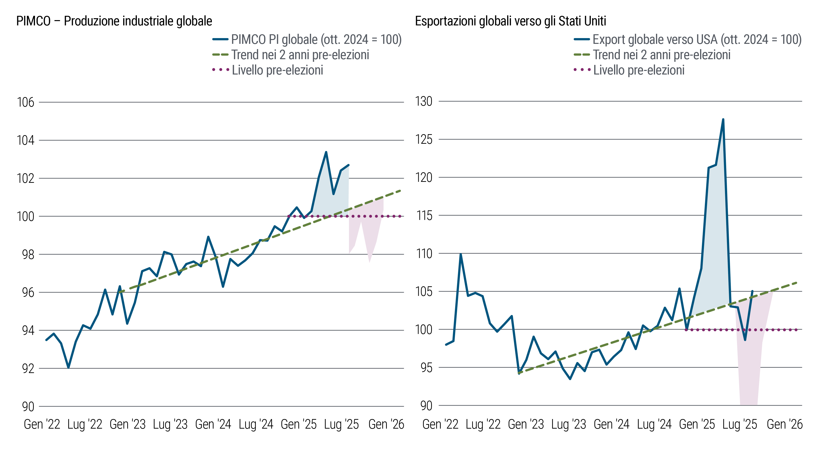 - Innanzitutto, consumatori e imprese hanno aumentato le attività nella parte iniziale dell'anno, anticipandole prima dei dazi. L’accumulo di scorte ha accelerato la produzione industriale e gli scambi globali (cfr. Figura 1). Adesso che i dazi sono in vigore, potrebbe seguire un periodo di crescita più debole o di contrazione.