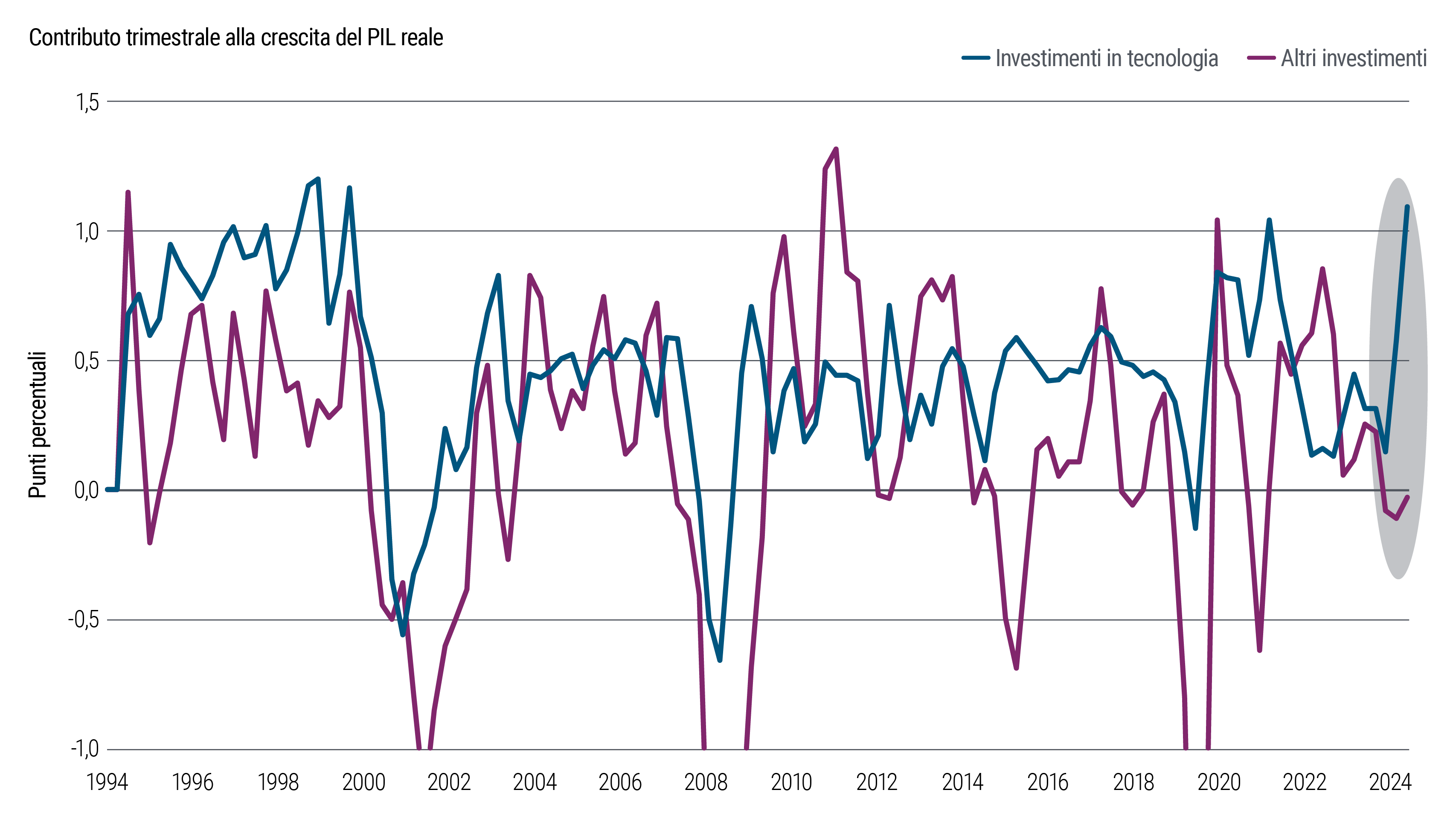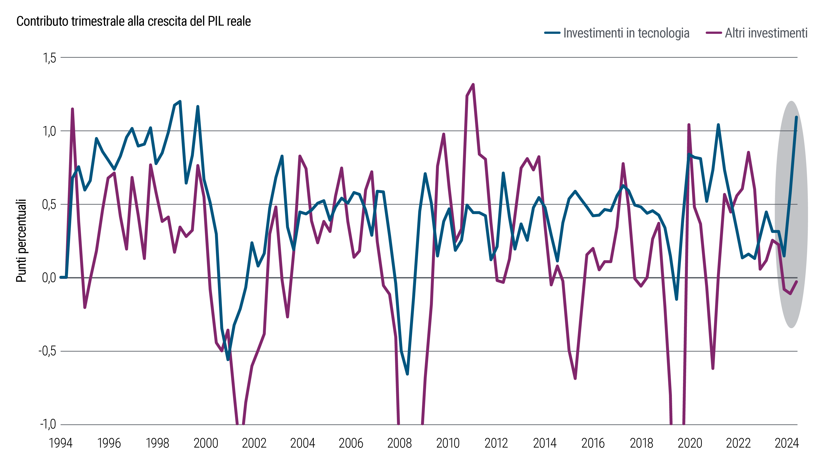I trend che si registrano nei dati globali segnalano che ci attende un periodo di maggiore debolezza prima che lo stimolo fiscale mirato in alcune regioni cominci a fare sentire i suoi effetti. Al contempo i consistenti investimenti in tecnologia sono destinati a proseguire, soprattutto negli Stati Uniti e in Cina, con potenziali effetti crescenti sulla produttività e sul mercato del lavoro.