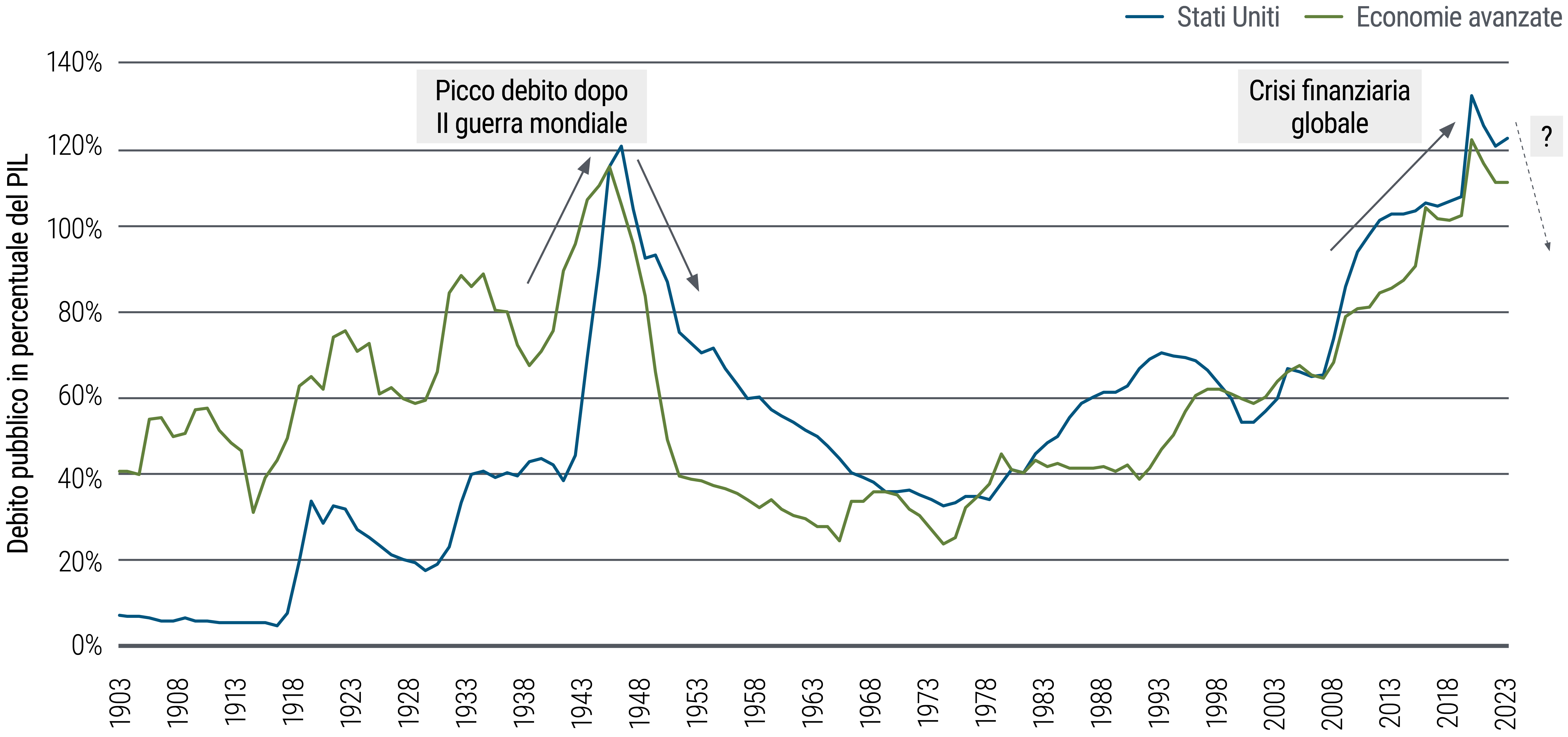 Resta da vedere se il vigore ciclico dell’economia americana si dimostrerà durevole o solo alimentato dagli stimoli fiscali del periodo pandemico e dall’aumento del rapporto debito/PIL. Se gli Stati Uniti alla fine affronteranno la questione fiscale, è probabile un consolidamento del debito attraverso riforme della spesa obbligatoria e aumento della tassazione. Per quanto improbabile possa sembrare nell’attuale contesto politico, anche le questioni che sembrano intoccabili potrebbero dovere evolvere.