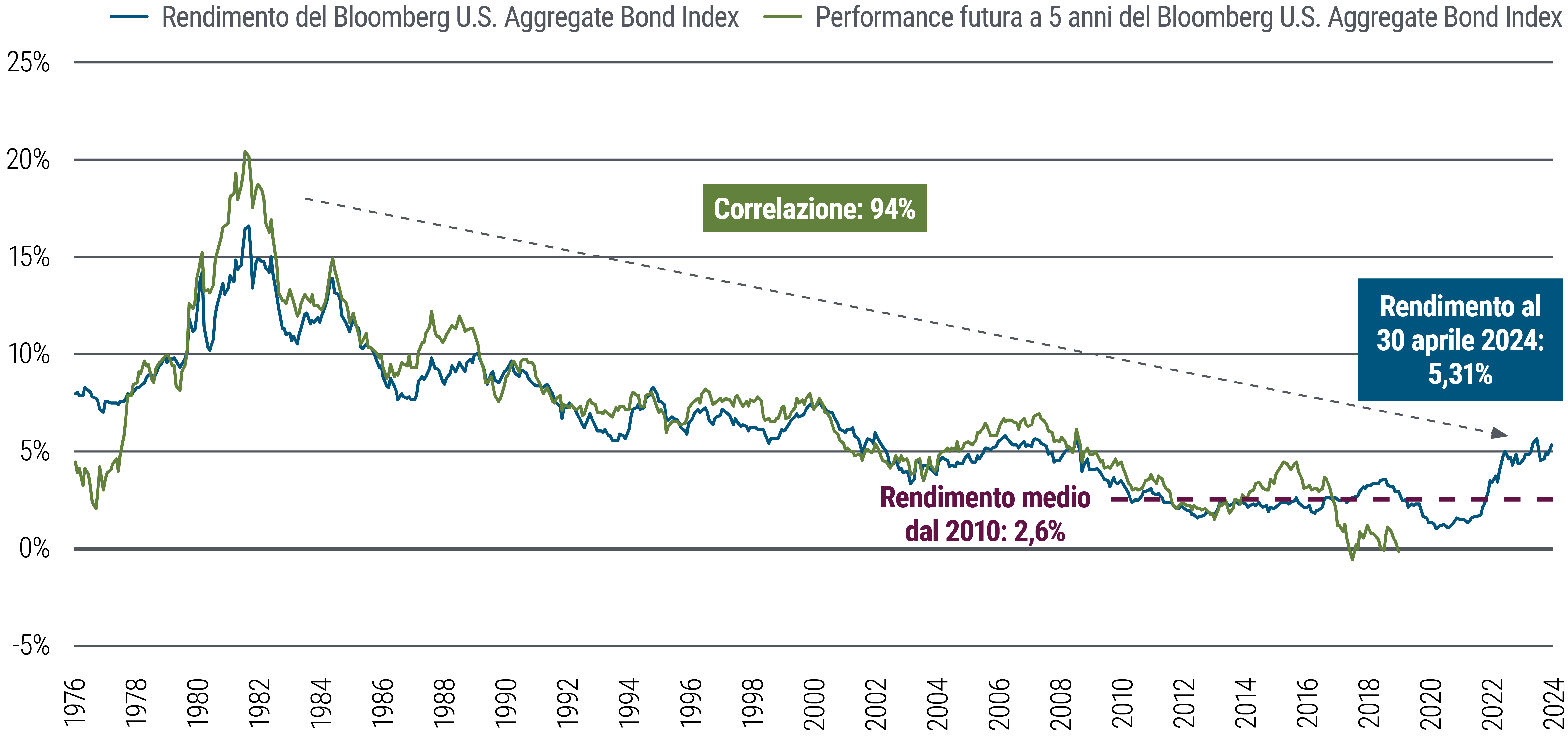 Lo shock inflazionistico dopo la pandemia e i successivi rialzi dei tassi da parte delle banche centrali hanno riposizionato a livelli nettamente più alti i rendimenti obbligazionari. Storicamente i rendimenti di partenza sono altamente predittivi della performance obbligazionaria su un orizzonte pluriennale (cfr. Figura 2). I rendimenti degli indici Bloomberg U.S. Aggregate e Global Aggregate (con copertura in dollari americani), due noti benchmark per l’obbligazionario di alta qualità erano rispettivamente intorno al 5,31% e al 5,41%, al 30 aprile 2024.