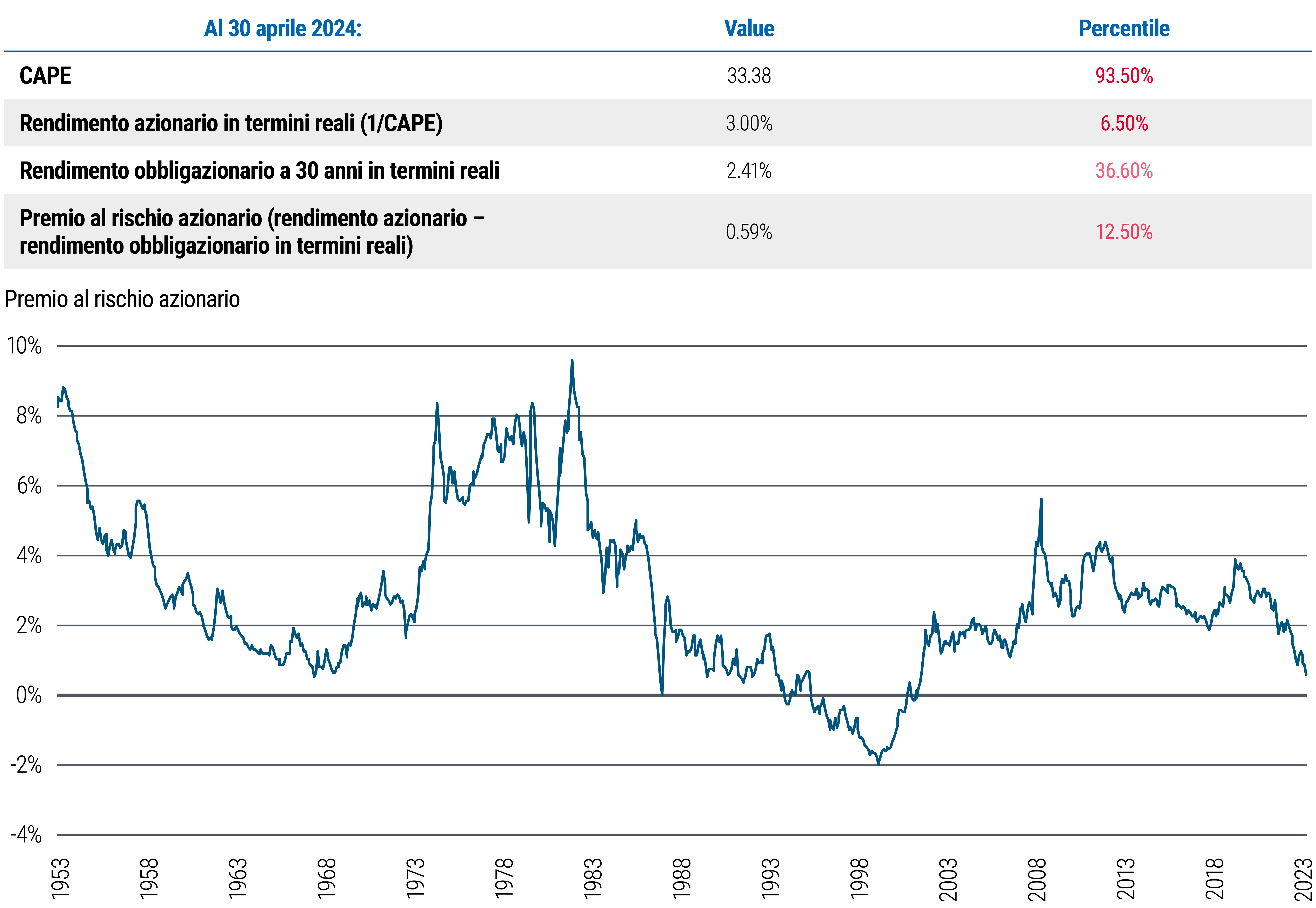 Le nostre previsioni sull’orizzonte secolare si innestano inoltre su quelle illustrate nelle ultime Prospettive Cicliche “Divergenza nei mercati, diversificazione nei portafogli”, in cui abbiamo indicato di attenderci percorsi differenti da parte delle banche centrali rispetto alla riduzione dei tassi in un contesto in cui persiste un relativo slancio di crescita negli Stati Uniti mentre molte altre principali economie dei mercati sviluppati hanno rallentato. Questo ha generato un tema di “incremento del rischio” sui mercati finanziari americani e indotto a interrogarsi se questi trend siano di breve periodo o più duraturi.