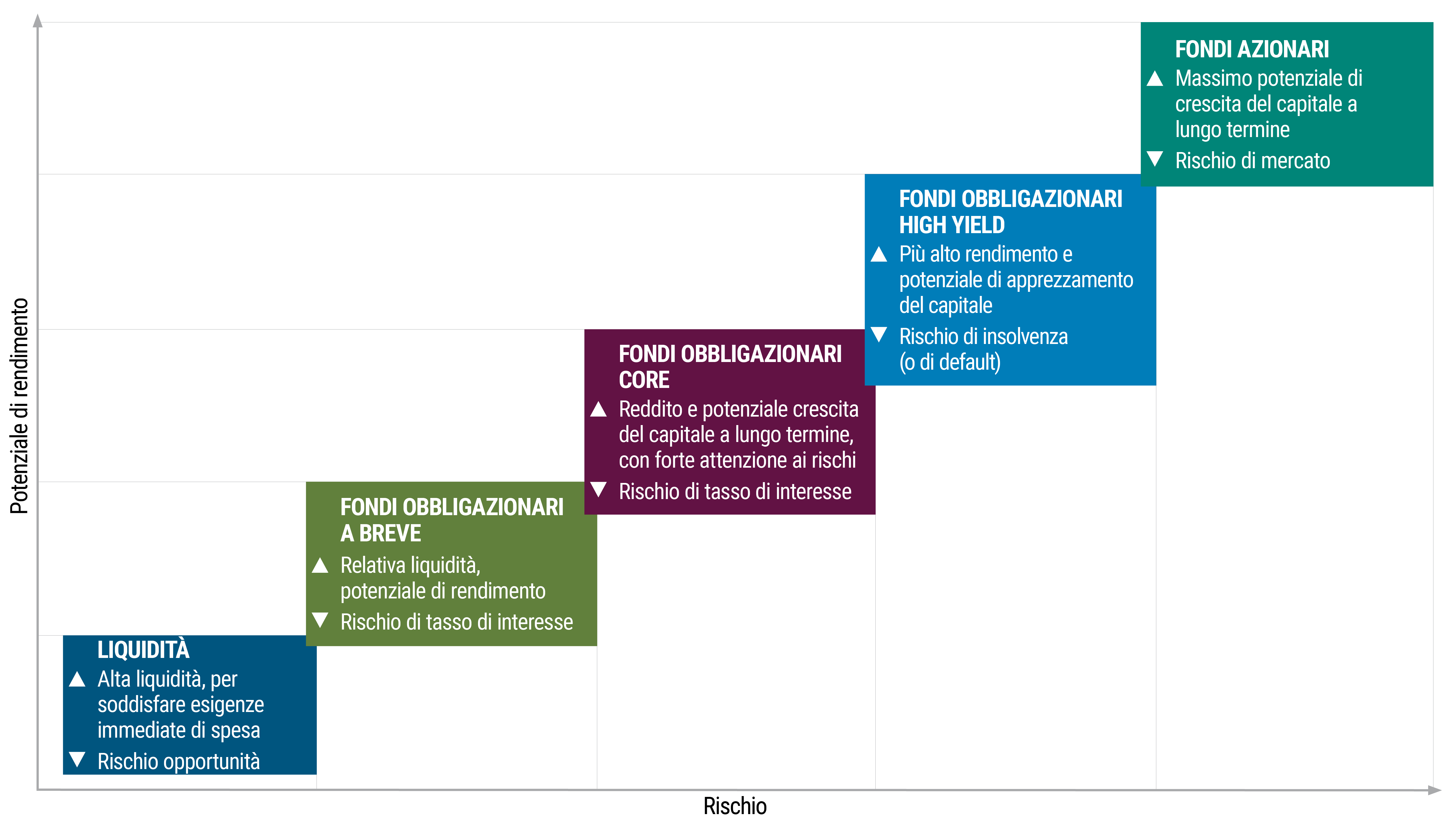 Ogni classe di attivo ha un proprio profilo di rischio/rendimento. La liquidità è considerata l'attivo meno rischioso, ma offre anche il potenziale di rendimento più basso. Per contro, le azioni e gli investimenti alternativi possono comportare un rischio maggiore, ma offrono anche un potenziale di rendimento più elevato.