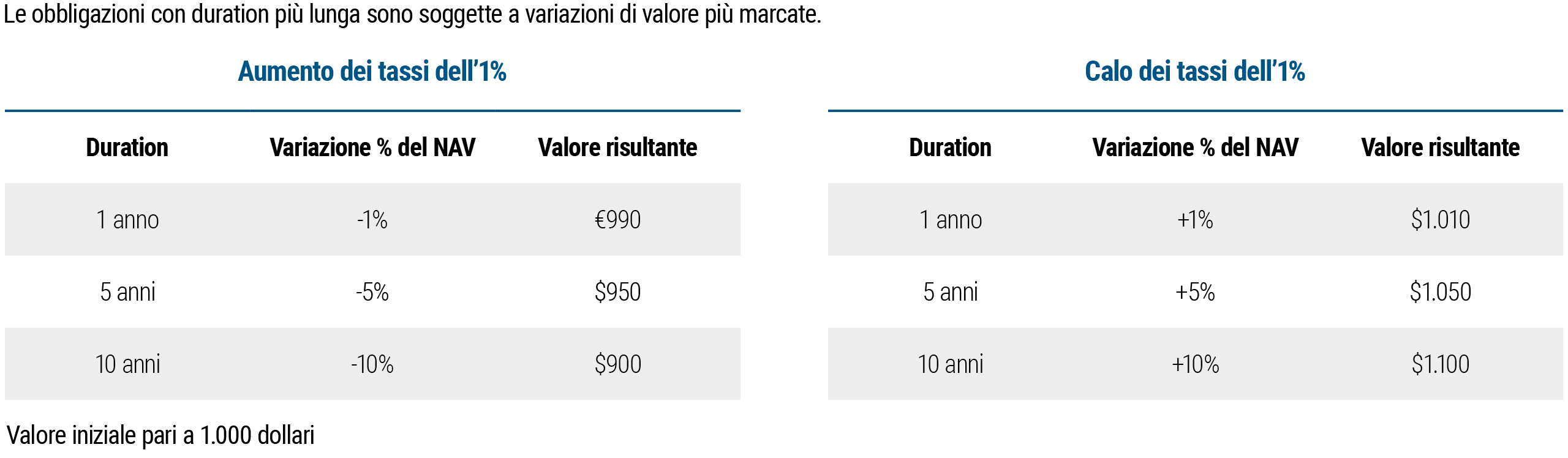 Come illustrato nella figura successiva, più la duration di un’obbligazione è breve, minore sarà probabilmente la sua volatilità. Ad esempio, se i tassi aumentassero dell’1%, la diminuzione di valore di un’obbligazione con duration pari a un anno sarebbe di appena l’1% in confronto al 10% di un’obbligazione con duration a 10 anni. Viceversa, se i tassi scendessero dell’1% le obbligazioni con duration più lunga registrerebbero incrementi di valore più consistenti di quelle con duration più breve.