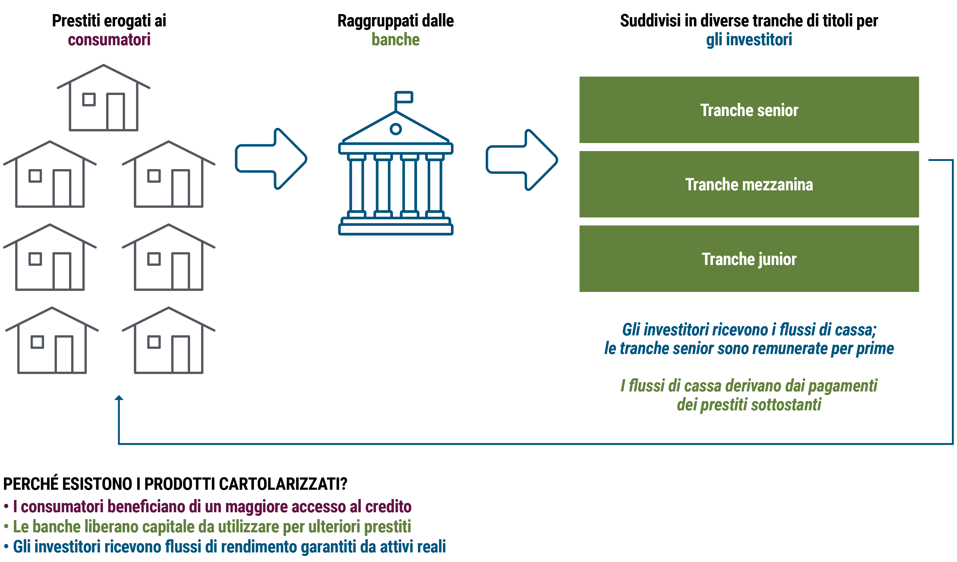 Quando una banca eroga un mutuo per l’acquisto di una casa, quel mutuo viene iscritto nel bilancio della banca e vi resta come posta largamente illiquida, riducendo il capitale disponibile per la concessione di altri mutui simili. Per liberare capitale e generare liquidità, la banca crea portafogli in cui raggruppa da alcune centinaia ad alcune migliaia di mutui simili sulla base dei quali vengono emesse le diverse tranche di titoli che vengono poi collocati sul mercato obbligazionario. Il rischio che un singolo mutuatario non onori i pagamenti è diluito all’interno del portafoglio di mutui riducendo il rischio per l’investitore.