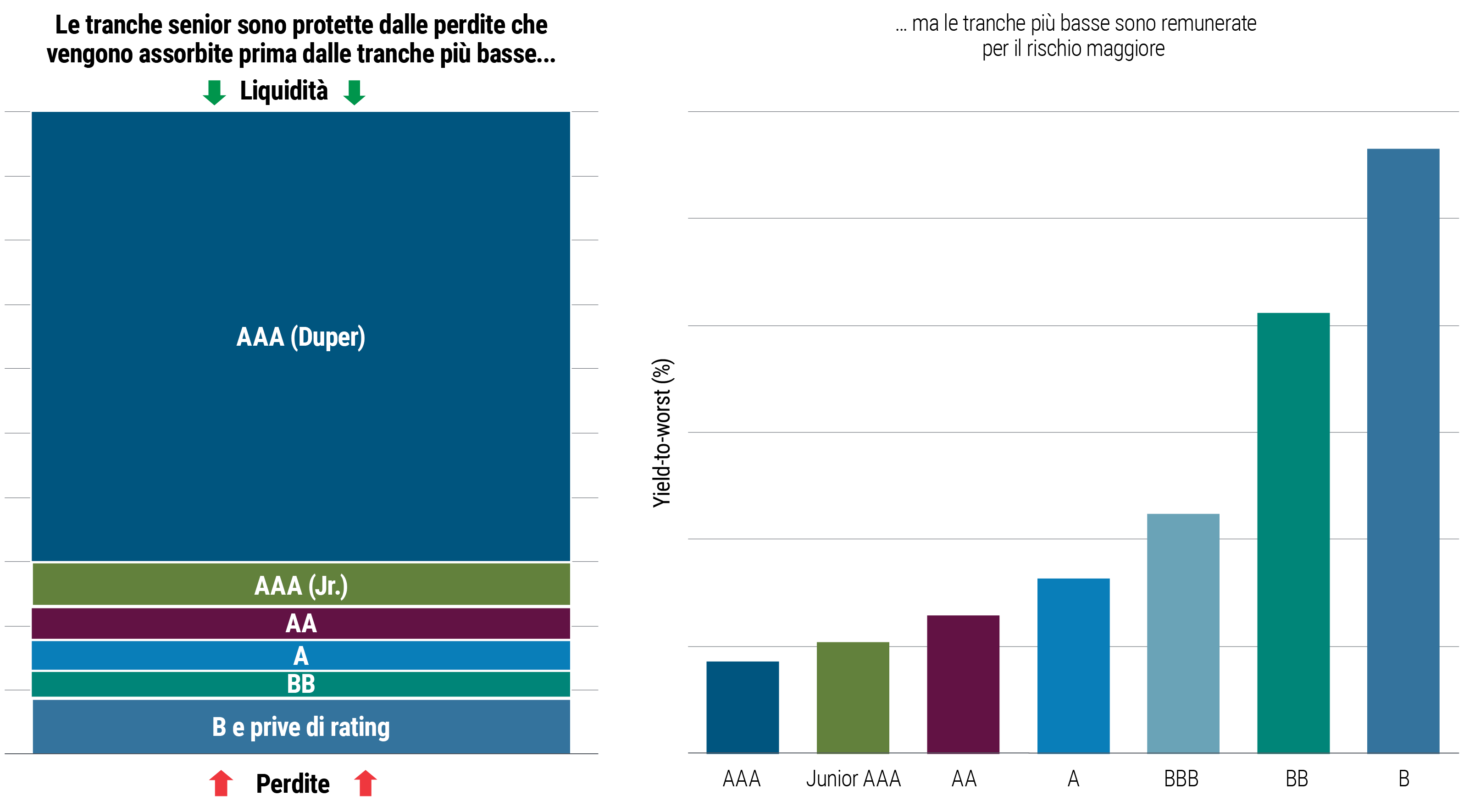 Come illustra il grafico di sinistra, la struttura della cartolarizzazione è concepita per proteggere le tranche senior (quelle con rating AAA, AAA (Jr.), AA, A, e BBB) da perdite. Le tranche junior (quelle con rating BB e B) sono remunerate per la maggiore esposizione al rischio, come mostra il grafico a destra.