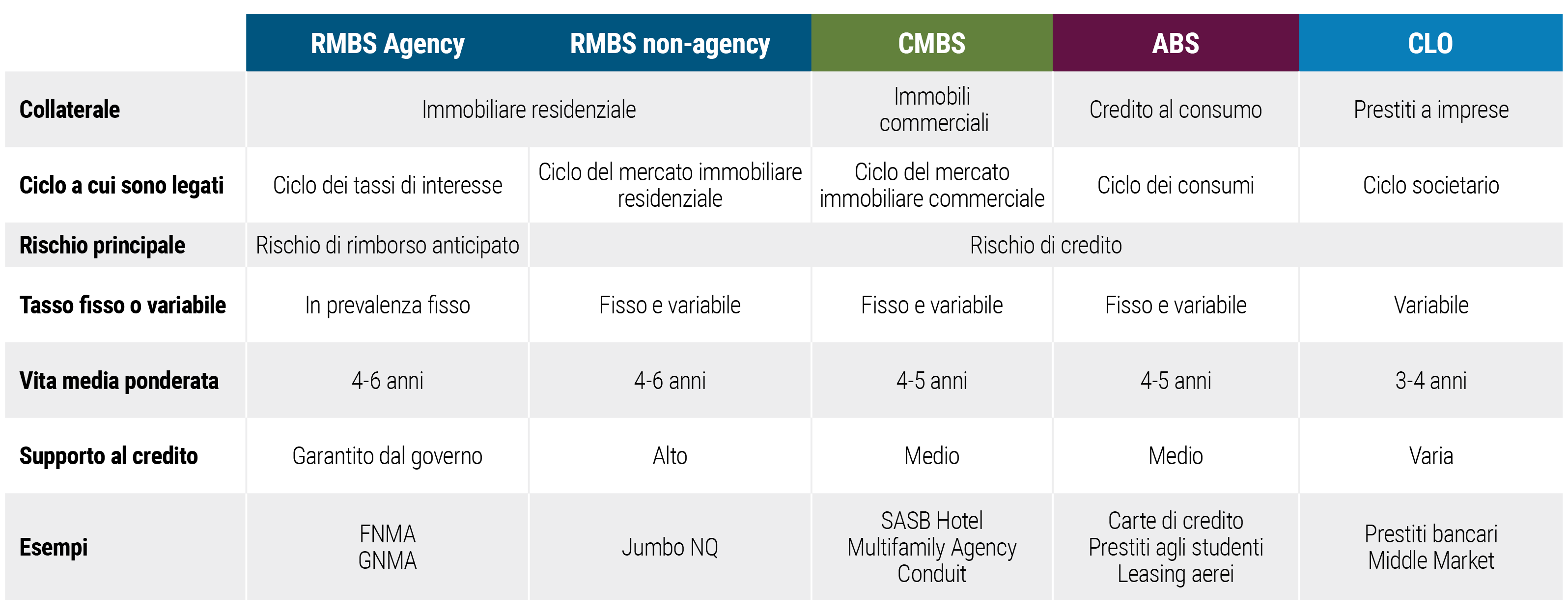 I prodotti cartolarizzati tipicamente sono esposizioni ai rischi del credito al consumo e immobiliare anziché ai rischi societari delle obbligazioni corporate. Offrono una modalità liquida per assumere posizioni nel credito immobiliare residenziale o commerciale, nel credito al consumo o altri tipi di credito che potrebbero non trovare diretta espressione in altre aree del mercato obbligazionario.