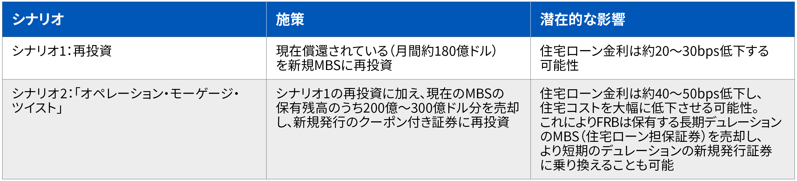 さらに積極的な選択肢として、毎月200~300億ドルの既存のMBSを売却し、その資金を新規証券に再投資する方法もあります(図表2参照)。これにより、住宅ローン金利を40~50bps引き下げる効果が期待できます。