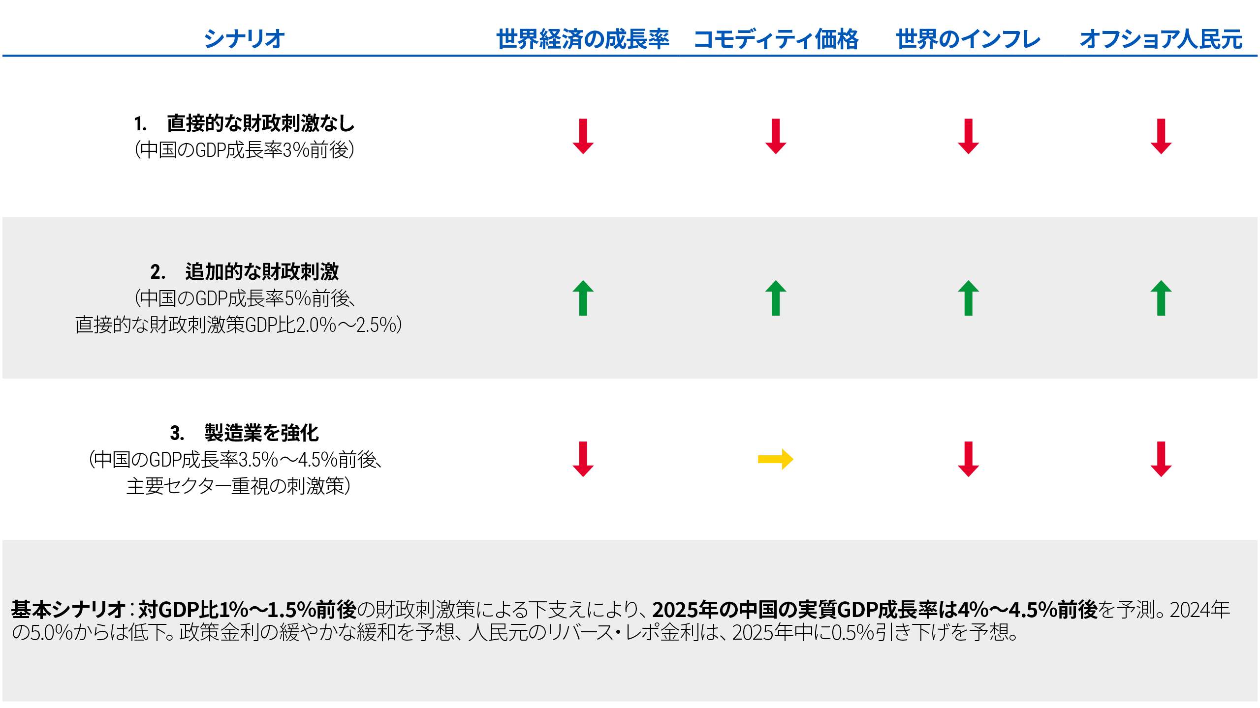 アジア太平洋市場とグローバル市場への影響を評価するにあたり、PIMCOでは基本シナリオに加え、代替的な財政シナリオを3通り想定し、分析しました。直接的な刺激策をとらない場合、追加の財政刺激策をとる場合、製造業を重点的に強化する場合です。