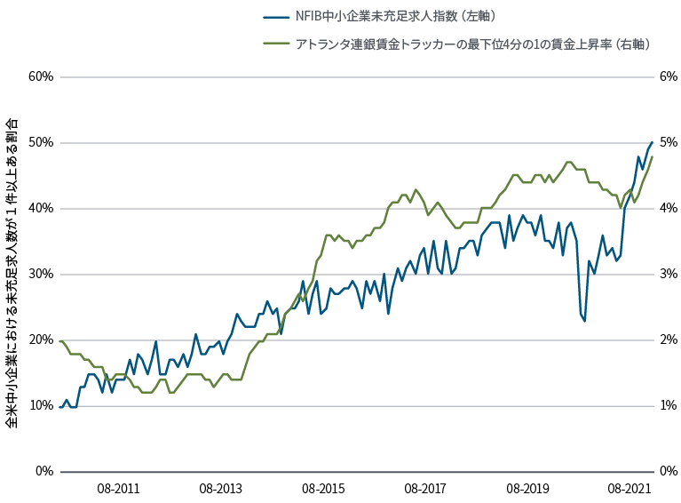 多くの投資家は、新型コロナウイルスの世界的流行(パンデミック)が世界経済に及ぼした構造的な影響に注目しています。なかでも顕著に影響を受けたのは、労働市場です。労働市場では、一時的な要因だけでなく、持続的な要因によって労働力不足が生じています。2021年に労働供給を圧迫した短期的な制約要因としては、新型コロナウイルスに対する根強い不安、政府の財政支援策、育児に関する課題などが挙げられます。ワクチンが継続的に効果を発揮し、変異株による経済への影響が抑えられ、学校への通学が継続し、失業手当の失効が多くの労働者の職場復帰を促していることが確認できれば、こうした短期的な制約要因は早期に緩和されるはずです。また中期的には、移民の受け入れ制限が労働市場に対する見通しを圧迫する可能性があります。