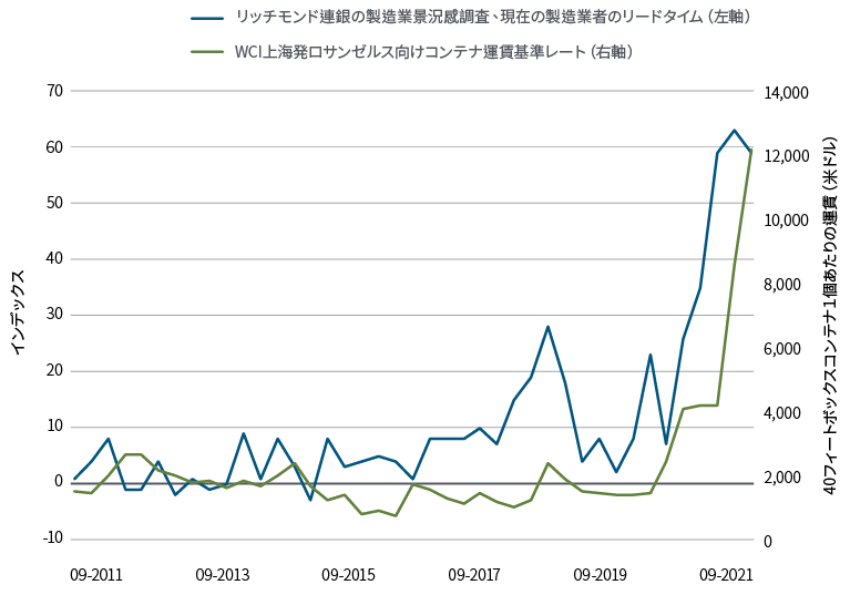 今年の需要を満たす上で、もう一つの供給制約要因となったのが海運です。ロックダウン中に消費者の支出がサービスからモノへと変化したことで輸送需要が急増し、太平洋航路の輸送量は、パンデミック前の水準を28%上回りました。新型コロナウイルスの蔓延により多くの航路が混雑し、世界規模で事故が多発しました。大々的に報道されたスエズ運河の事故がその一例です。中国のゼロ・コロナ政策やいくつかの気象災害により、世界最大級のターミナルが閉鎖に追い込まれ、深刻な混乱が生じました。こうした出来事が重なり、海運のボトルネックを悪化させた結果、上海発ロサンゼルス向けの運賃が10倍になるという未曾有の事態に至っています。(図表3を参照)。