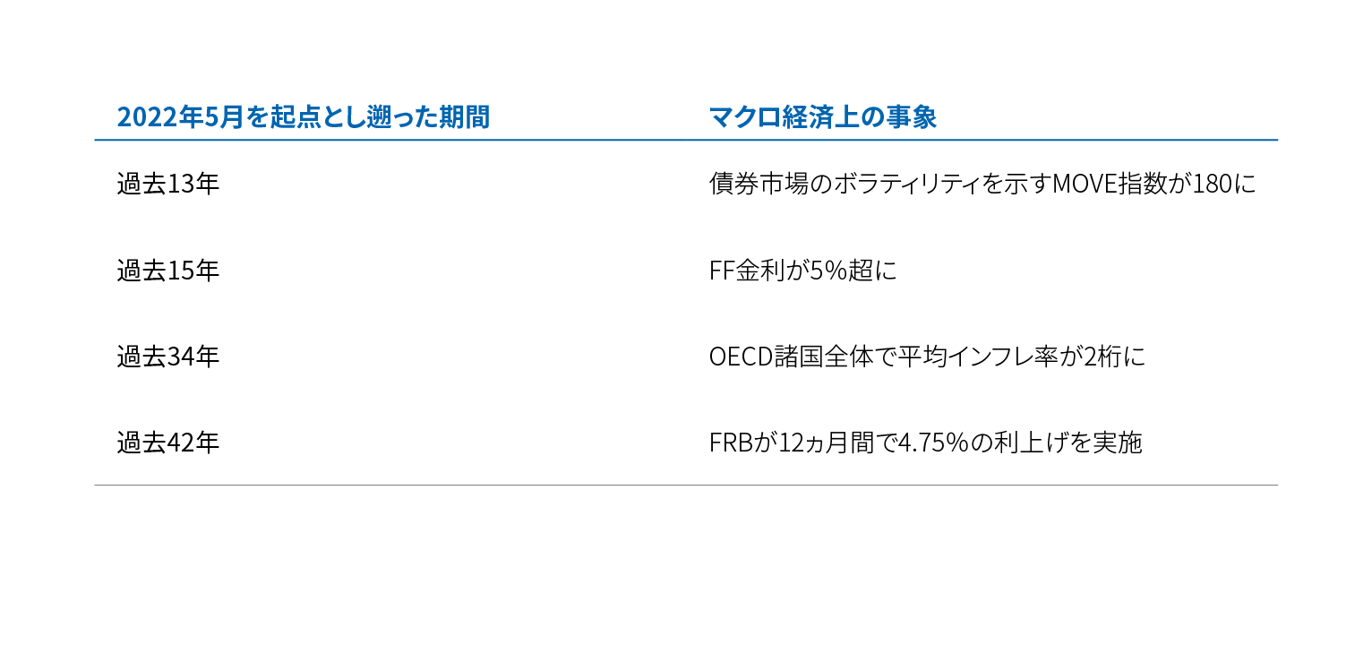 - 過去40年で最大の世界的インフレの持続的亢進に対する、タカ派的金融政策の転換