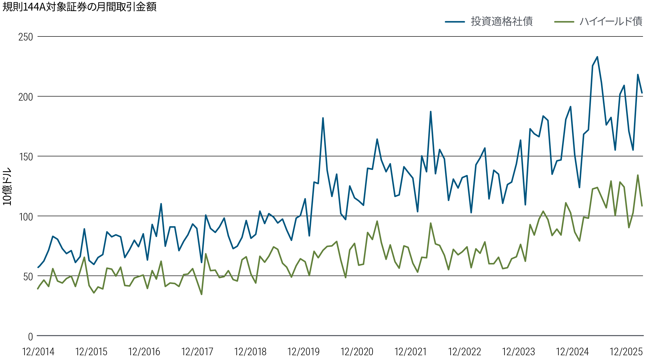 参考までに、規則144Aに基づく私募証券は、米ドル建ての投資適格債市場の約18%、ハイイールド債市場の約82%を占め、月間取引金額はそれぞれ2,000億ドル、1,000億ドル前後で推移しています(図表1)。したがって、投資適格かどうかにかかわらず、流動性が確立している規則144A市場と、一貫して流動性に欠ける真のプライベート・クレジット市場を区別することが、極めて重要になります。