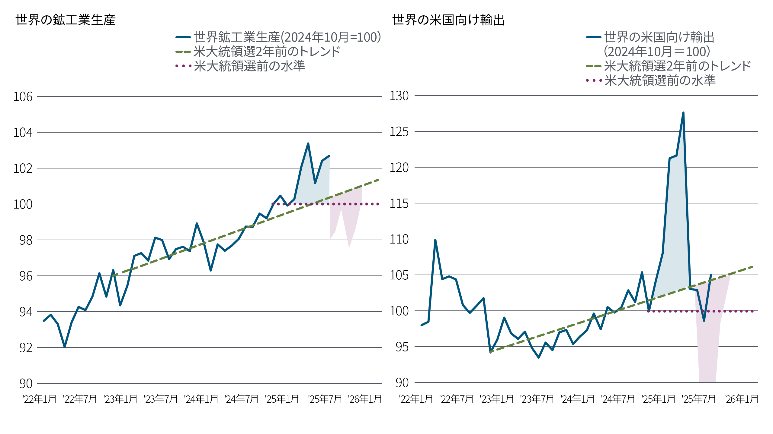貿易理論によれば、米国の関税は、米国の輸入価格を引き上げる一方、諸外国の輸出価格を引き下げ、実質貿易数量を減少させ、世界の実質所得を圧迫する傾向があると示唆されています。しかし、現時点ではこうした影響は顕在化していません。むしろ、世界の貿易量と財の生産は加速し、世界の財のインフレは底堅く推移する一方、米国のインフレは抑制されています。