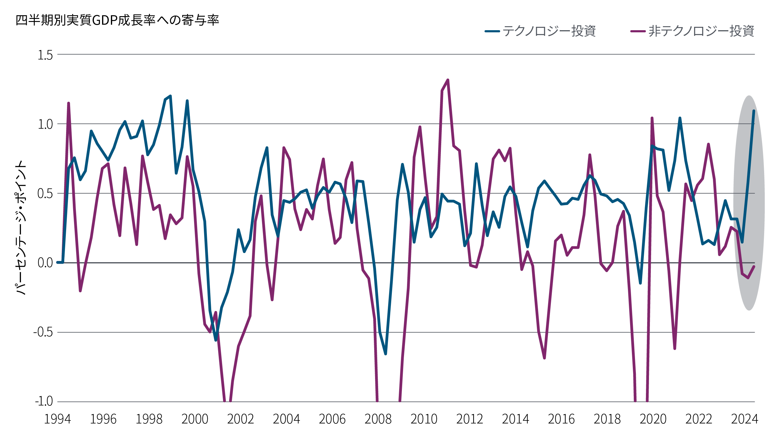 世界的な経済指標は、今後一時的な減速局面に入ることを示唆していますが、一部の地域で的を絞った財政刺激策が徐々に効果を発揮し始める見込みです。その一方で、特に米国と中国を中心としたテクノロジー分野への投資は堅調に推移しており、生産性や労働市場への好影響が広がる可能性があります。