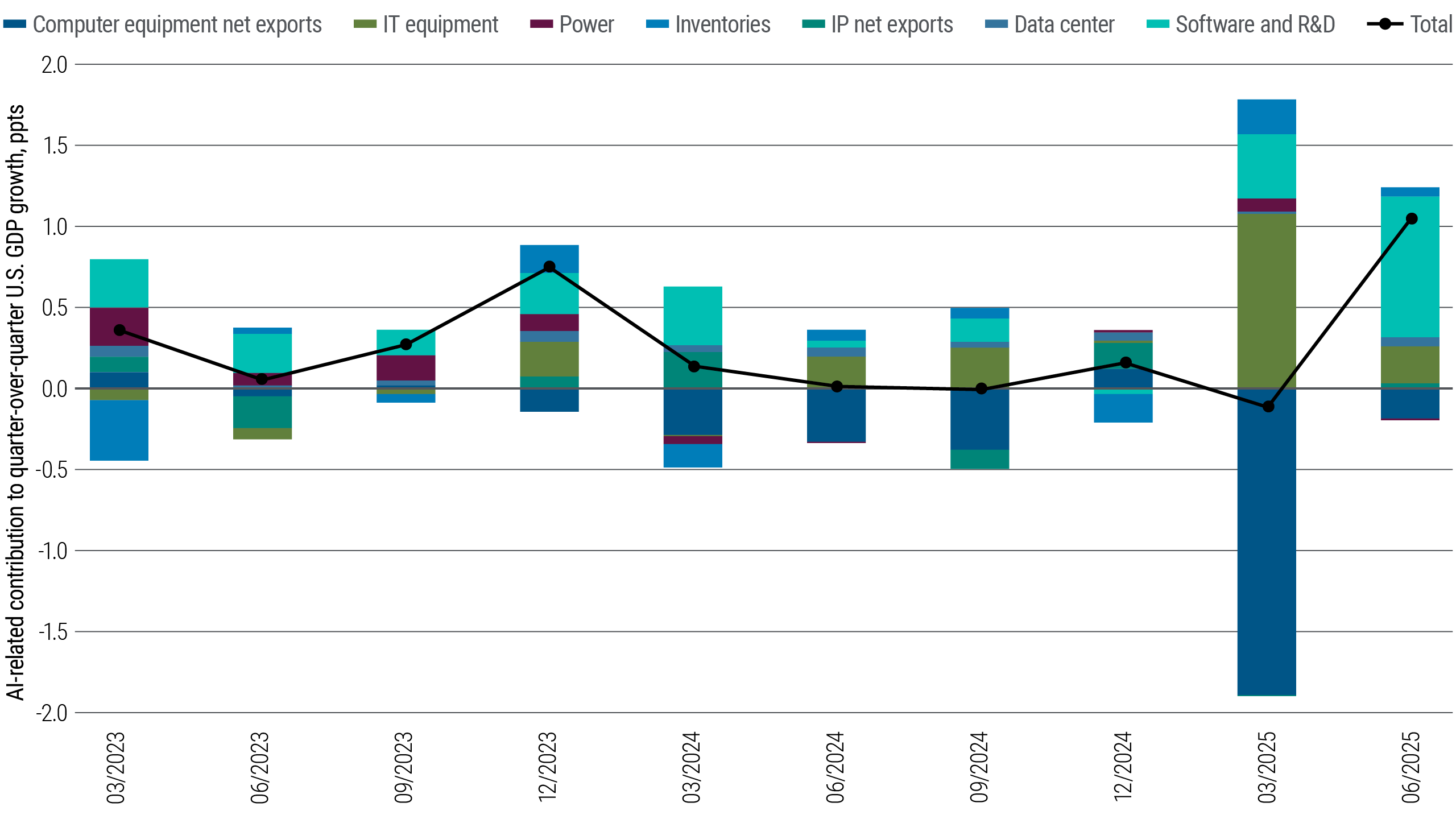 Overall, we estimate that AI-related activity contributed roughly 0.5 ppts to GDP growth in the first half of 2025 (see Figure 1) – a large impulse for any one industry, and reminiscent of the 1990s fiber-optic investment boom at the advent of the internet.