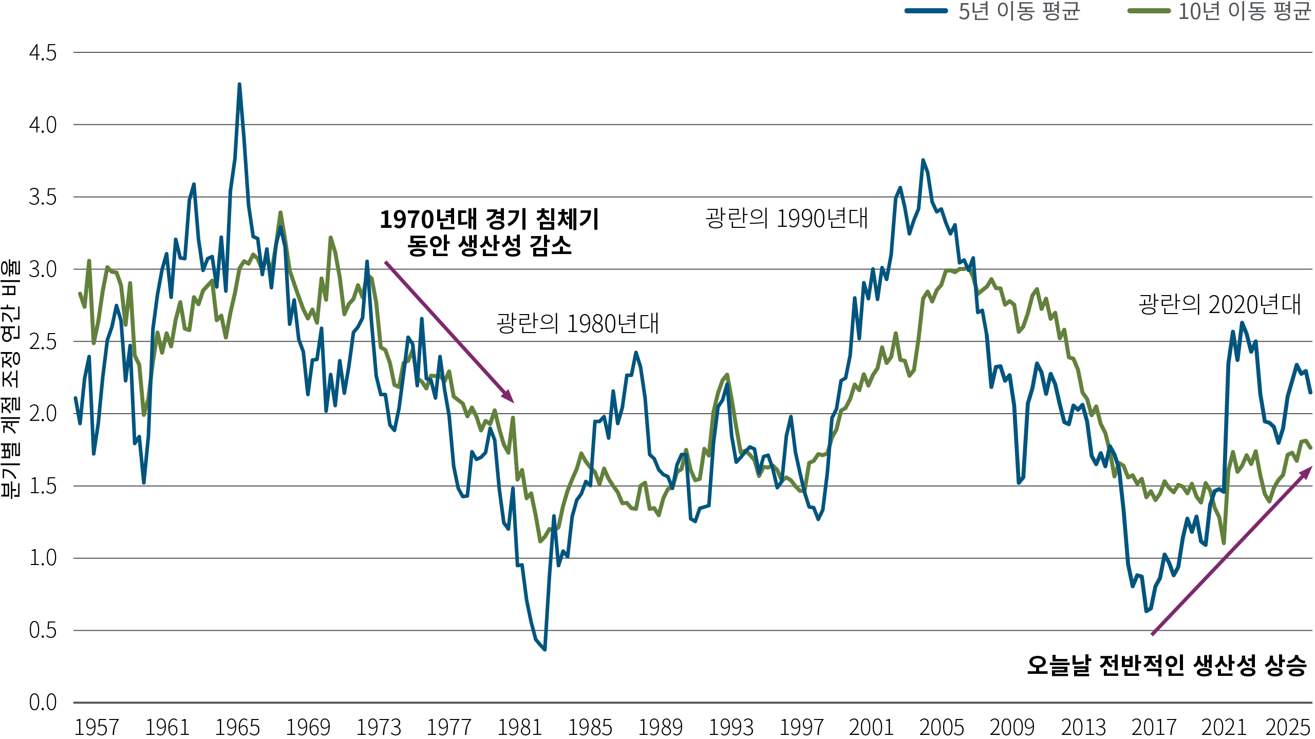 그럼에도 불구하고, 일부 에너지 위기로 인해 미국의 노동 생산성이 크게 하락했던 1970년대의 스태그플레이션 시기와는 달리, 미국의 노동 생산성은 비교적 잘 유지되었습니다.