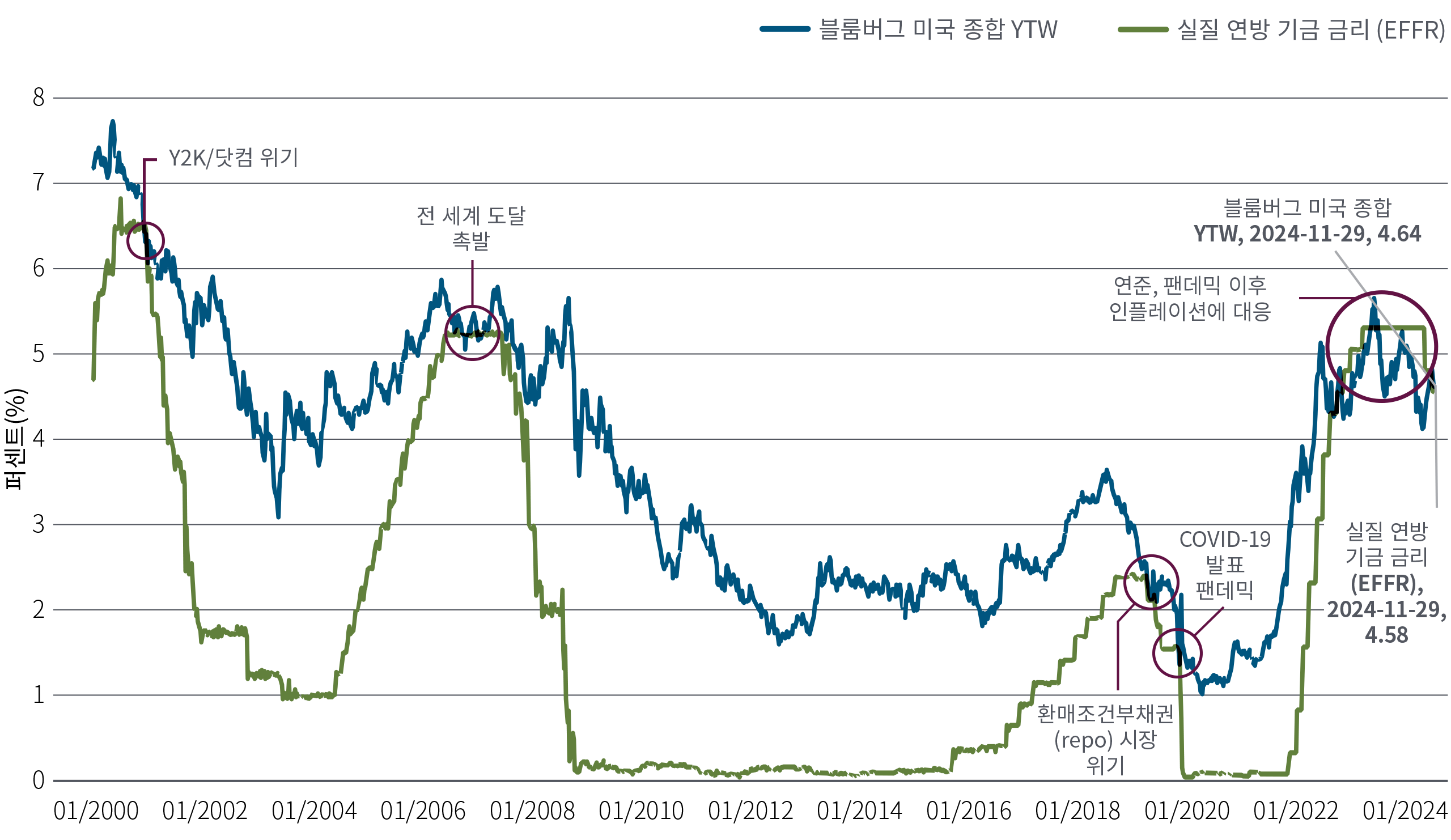 현재의 상대적 가치평가와 시장 상황을 바탕으로, 우리는 고품질이고 유동적인 공모 채권이 매력적인 가치를 제공한다고 믿습니다. 초기 수익률은 현금을 포함한 위험 및 유동성 스펙트럼 전반에 걸쳐 타 자산 대비 매력적이며, 역사적으로 초기 수익률은 장기 채권 성과의 강력한 지표였습니다.