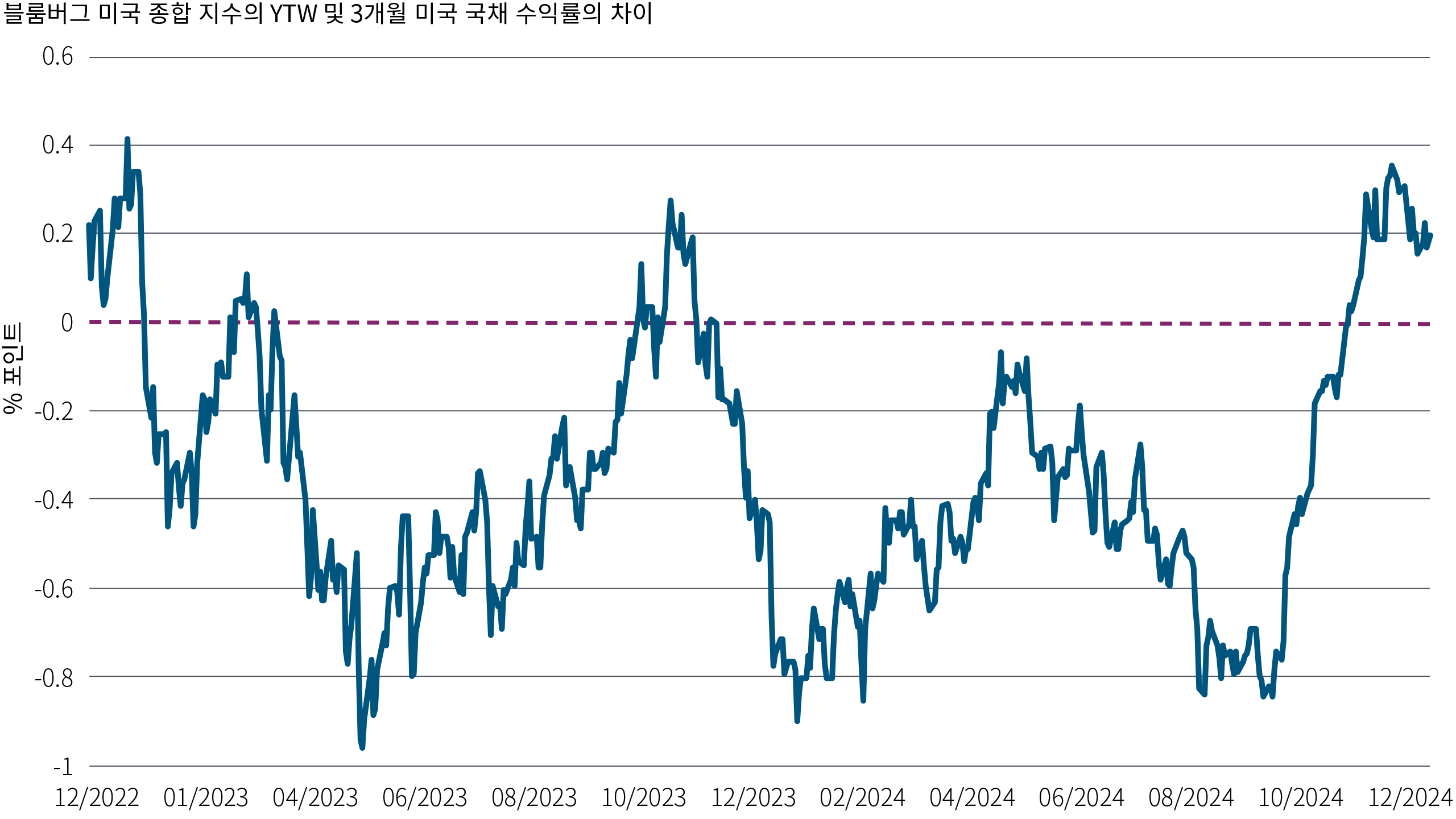 동시에 우리는 채권 수익률이 팬데믹 시대의 최저 수준에서 대폭 상승하는 모습을 목격했습니다. 금리가 하락하면서 수익률이 감소하는 상황에서 채권은 현금 대비 더욱 매력적인 기회를 제공합니다. 현금의 또 다른 일반적 대체 지표인 3개월 미국 국채 수익률과 동일한 코어 채권 지수 수익률을 비교해보십시오(그림 2 참조). 현금과 채권 모두 지난 2년 동안 매력적인 수익률을 제공했지만, 현금 투자자는 본질적으로 이러한 수익률을 장기간 고정할 수 없습니다. 연준이 정책 금리를 50 베이시스포인트(bp) 인하한 9월 이후, 코어 채권 대비 현금 수익률 전망은 급격히 약화되었습니다.