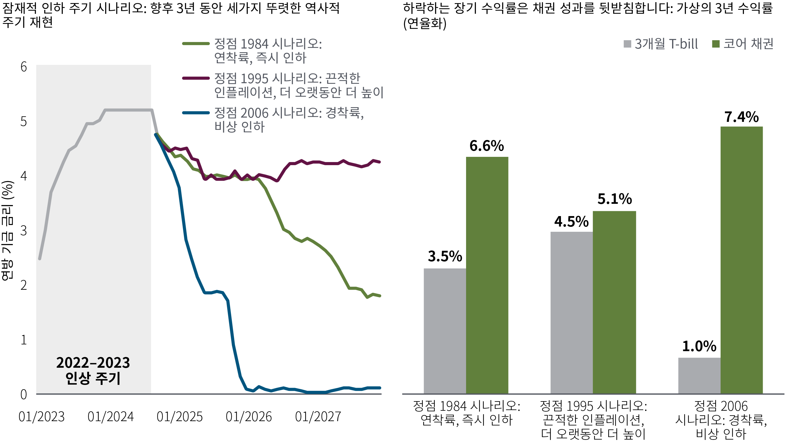 채권 시장은 실질적으로 투자자들이 리스크를 헤지하고 다각화할 수 있는 기회를 효과적으로 제공하고 있습니다. 주식 시장은 금리 인하 주기에 대해 보다 파란만장한 역사를 가지고 있으며, 시간이 지남에 따라 일반적으로 변동성이 더 컸습니다. 또한 우리는 전 세계 주요 경제권에서의 리더십 변화와 함께 지정학적 불안이 고조되는 시기에 있습니다.