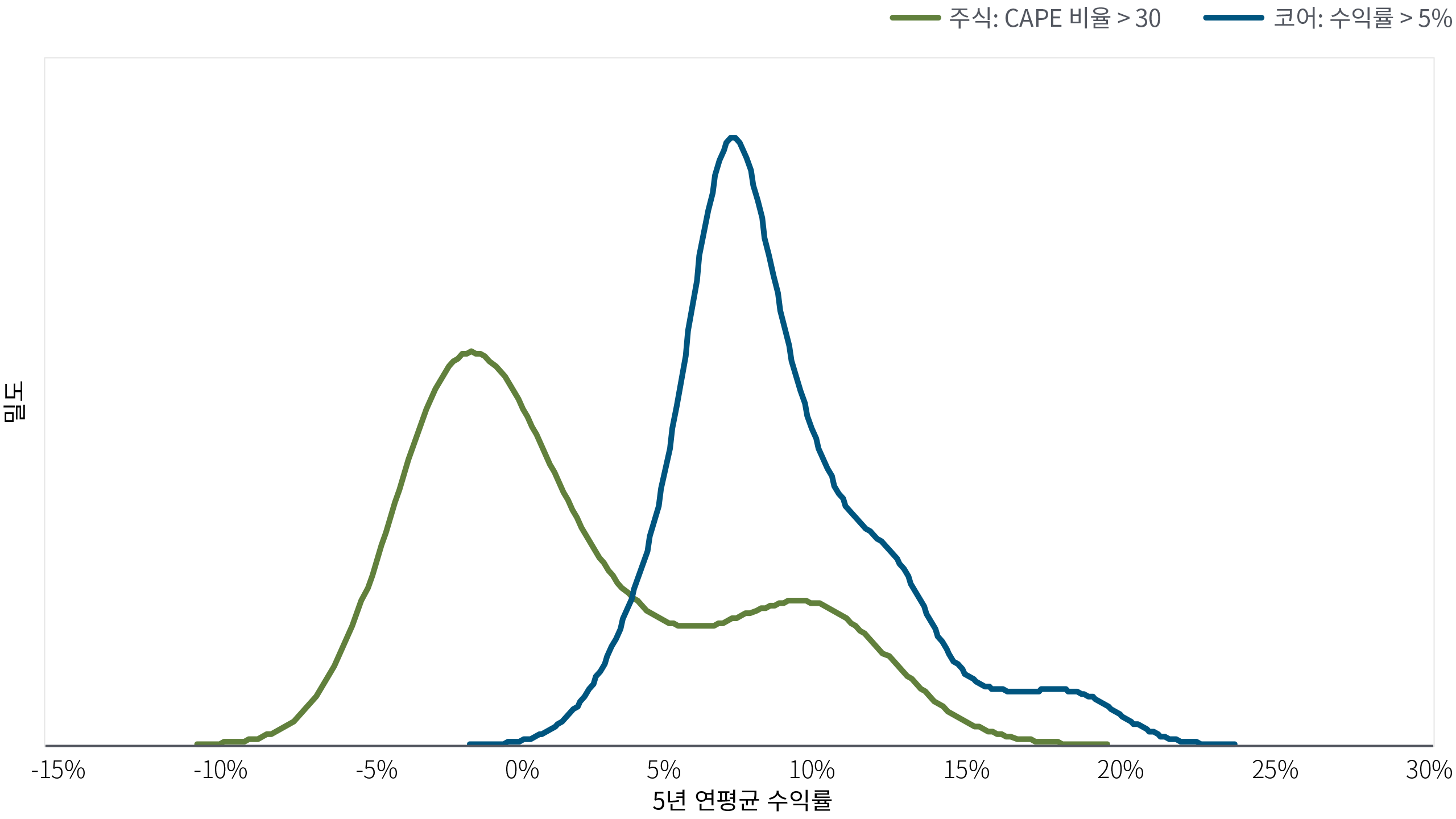 역사적 추세도 매력적인 위험 헤지 수단으로서의 채권을 지지합니다. 1973년 이후 채권 및 주식 시장을 평균적으로 살펴보면, 미국 코어 채권 수익률이 5% 이상이면서 미국 주식의 어닝 비율이 30을 넘었던 기간(현재와 같음)에는 채권이 더 높은 후속 5년 수익률을 제공했으며(그림 4 참조), 잠재적으로 더 낮은 변동성을 시현했습니다.