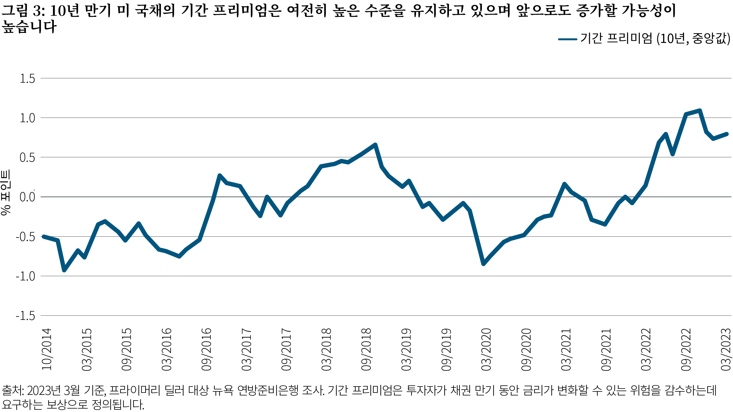 미국 정부 부채가 GDP의 100% 이상으로 증가하고, 인플레이션 위험 프리미엄이 돌아올 가능성이 있는 상황에서 미국 국채의 기간 프리미엄은 증가할 가능성이 높으며 수익률 곡선을 가파르게 만드는 중장기적 요인으로 작용할 수 있습니다(그림 3 참조). 그 곡선은 오늘날 역전되었지만, 우리는 투자자들이 결국 더 높은 인플레이션 불확실성을 감안할 때 중장기 채권에 대해 더 많은 수익률을 요구할 것으로 예상합니다. 그것은 채권의 매력을 더욱 증가시킬 것입니다.