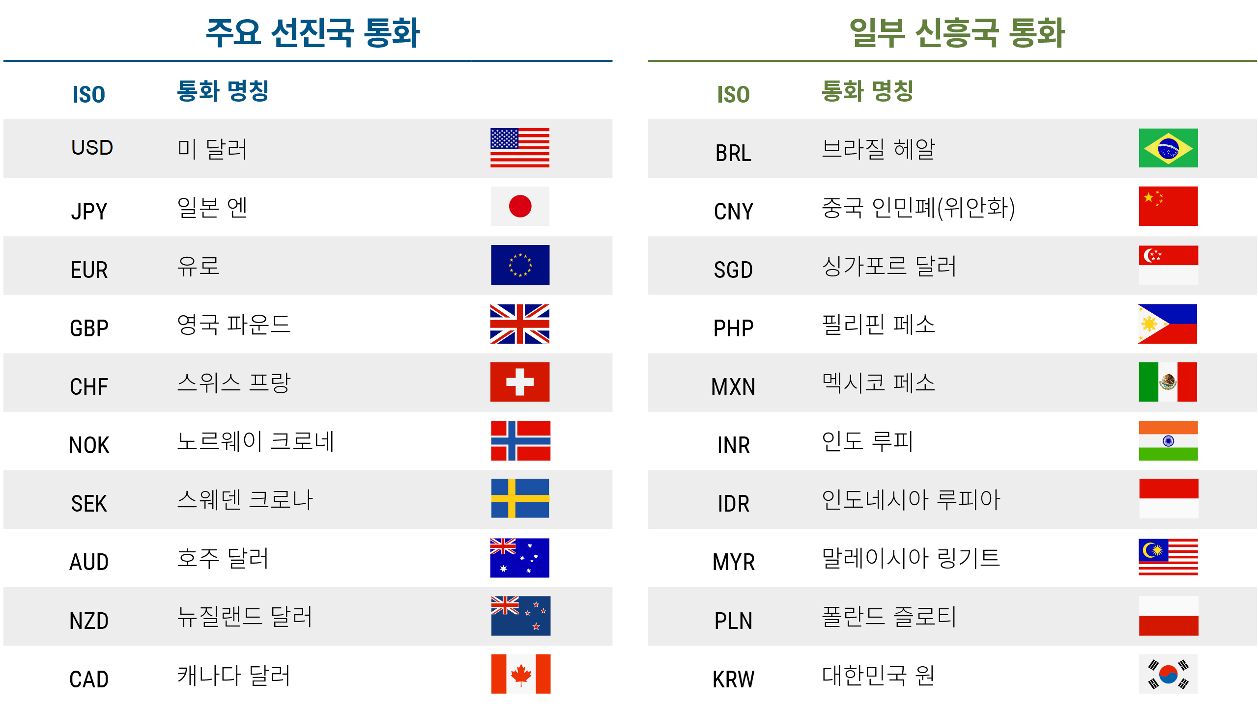 통화란 한 국가나 지역에서 사용되는 화폐, 즉 공식 결제수단을 의미합니다. 가장 잘 알려진 통화로는 미국 달러($), 유로(€), 일본 엔(¥), 영국 파운드(£), 스위스 프랑 등이 있습니다. 대부분의 통화에는 고유한 기호가 존재하지만, 외환(FX) 시장에서는 ISO(국제표준화기구) 코드를 사용해 통화를 구분합니다. 이러한 ISO 코드 중 일부는 아래 차트에 나와 있습니다.