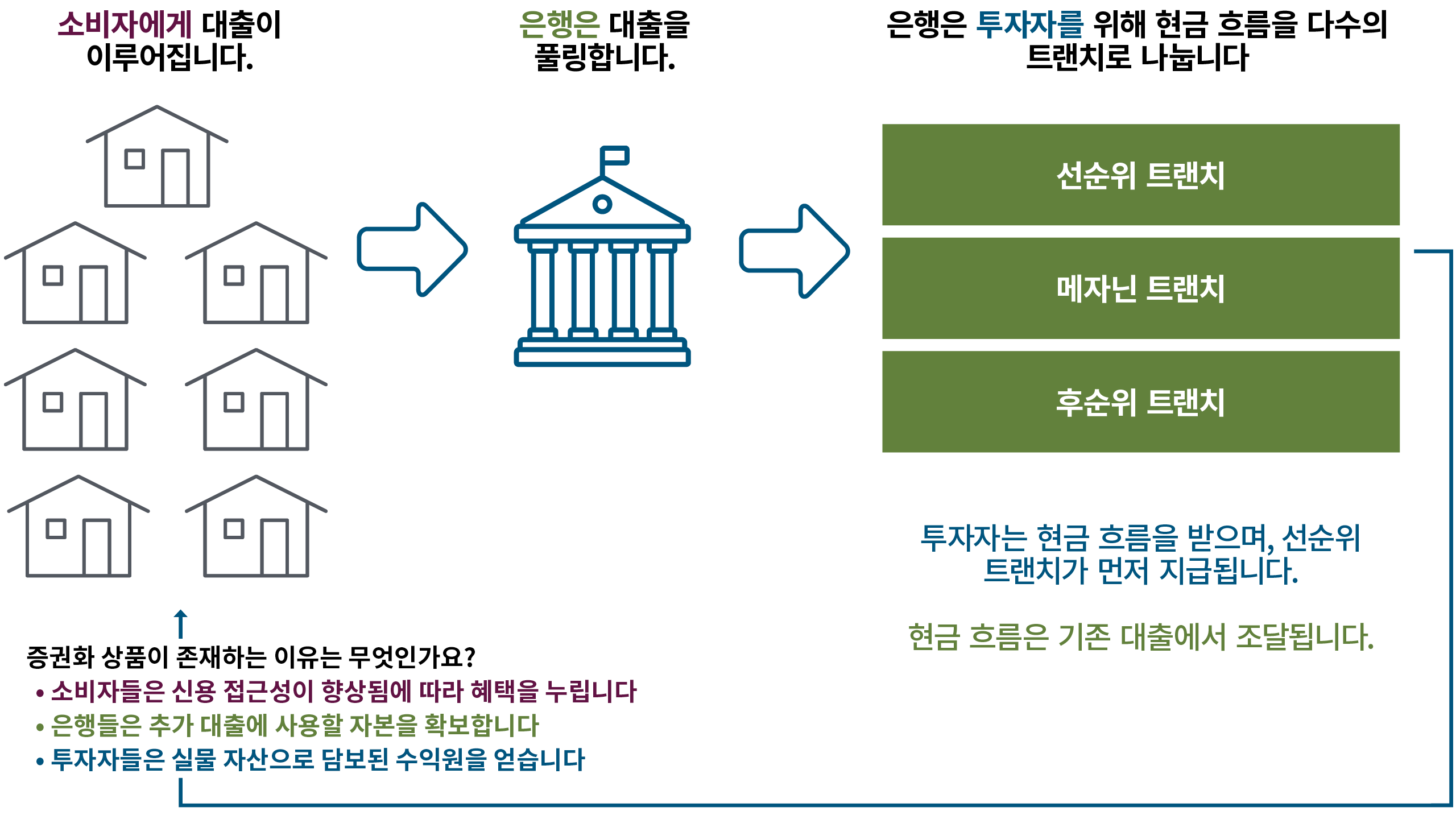 은행이 개인에게 주택 구입 목적의 대출을 제공하면, 해당 모기지는 은행의 대차대조표에 유동성이 거의 없는 상태로 남아, 유사한 대출을 원하는 사람들을 위해 은행이 보유하고 있는 자본을 일부 소진하게 됩니다. 자본을 확보하고 유동성을 창출하기 위해 은행은 수백에서 수천 건의 유사한 모기지를 모아 작은 조각으로 나눈 후 채권시장에 판매합니다. 이렇게 하면 개별 모기지 보유자 한 명이 모기지 상환을 하지 못할 리스크는 이제 전체 모기지 풀에 분산되어, 개인 투자자의 리스크가 줄어듭니다.