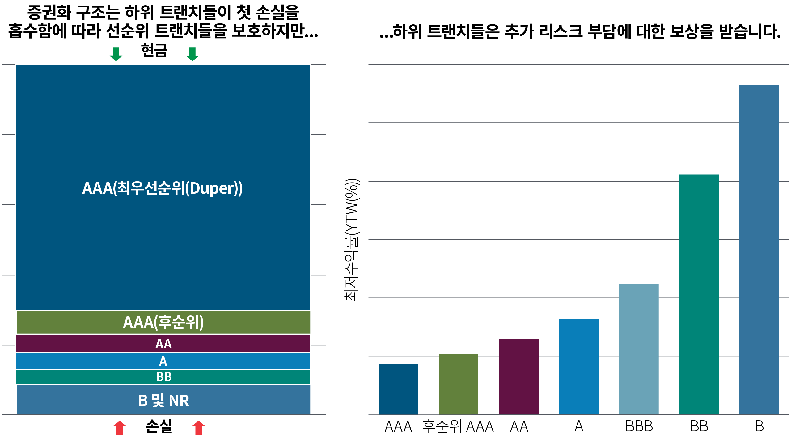 아래 좌측 차트에서 볼 수 있듯이, 이 증권화 구조는 선순위 트랜치(신용등급 AAA, AAA(Jr.), AA, A, BBB)를 손실로부터 보호하도록 설계되었습니다. 하지만 후순위 트랜치(신용등급 BB 및 B)는 아래 우측 차트에서 볼 수 있듯이 추가 리스크를 감수하는 대가로 보상을 받습니다.