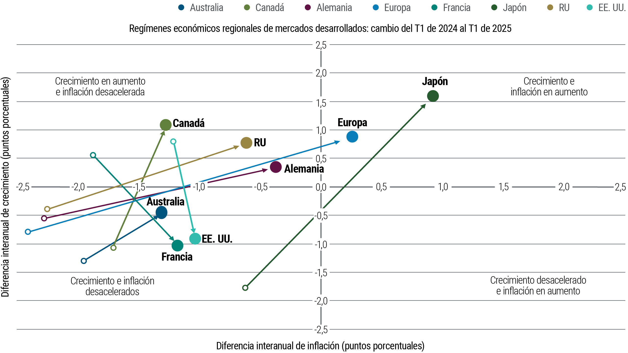 Los efectos de los cambios en la política comercial y fiscal aún no se reflejan claramente en los datos macroeconómicos, y las propias políticas están evolucionando rápidamente. Aun así, está claro que el excepcionalismo estadounidense se está desvaneciendo: nuestros rastreadores del ciclo económico muestran una desaceleración del crecimiento que contrasta con la reaceleración que se está produciendo en la mayoría de las economías desarrolladas (ver gráfico 2).