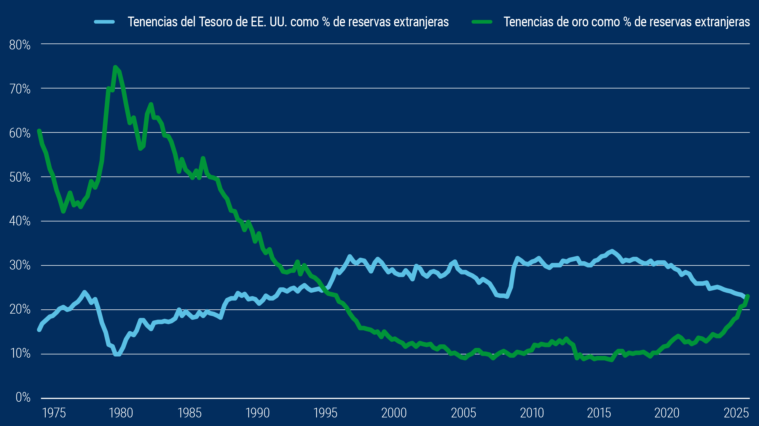 El panorama geopolítico sigue siendo un impulsor clave. La incautación de reservas rusas en 2022 ayudó a catalizar la acumulación de oro como reserva de valor políticamente neutral. Esta tendencia, junto con fricciones comerciales persistentes y el aumento de deuda soberana, sugiere un respaldo estructural para la demanda de oro. En nuestra opinión, un aumento del precio del oro superior a 10% durante el próximo año es factible.