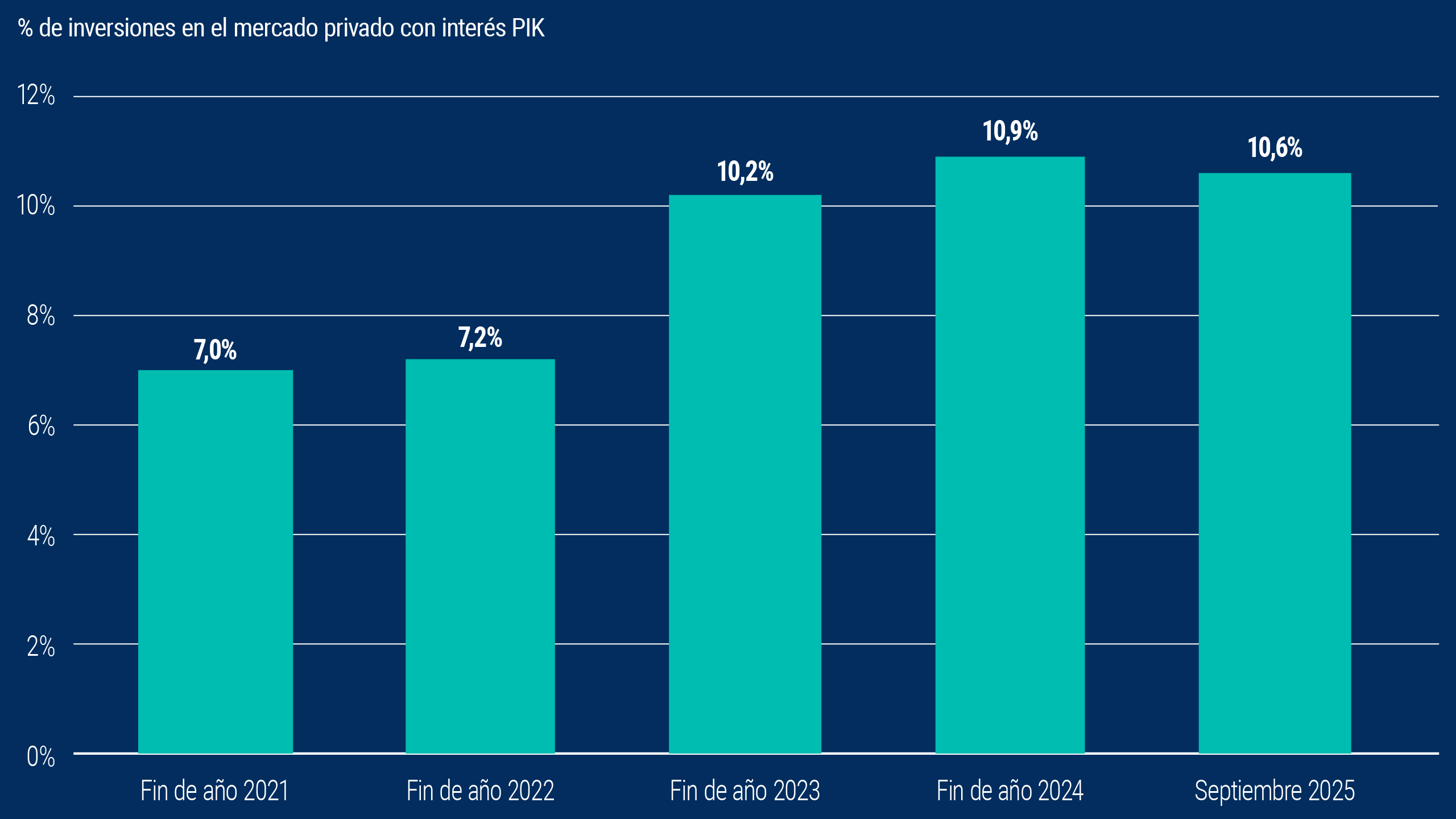 Si bien el servicio de la deuda puede volverse más fácil con tasas de interés más bajas, hemos observado que más compañías financiadas de manera privada están solicitando modificaciones en sus préstamos o pagando su deuda con deuda adicional, conocido como financiamiento de pago en especie (PIK), ambos signos potenciales de dificultades para el servicio de la deuda (ver el gráfico 4). De hecho, utilizando datos de PIK y otros indicadores, Lincoln International calcula una “tasa de incumplimiento en la sombra” de 6% al 21 de agosto de 2025, frente a 2% en 2021.